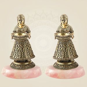 Enhance your pooja rituals with the Traditional Brass Deep Lakshmi pair, each measuring 4.75 inches and featuring an antique finish. Crafted from high-quality brass, these lamps are designed to provide a steady, serene light while symbolizing Lakshmi’s blessings of wealth and prosperity. Their enduring construction and elegant detailing make them ideal for both everyday worship and special occasions, adding a sacred and timeless touch to your home altar.