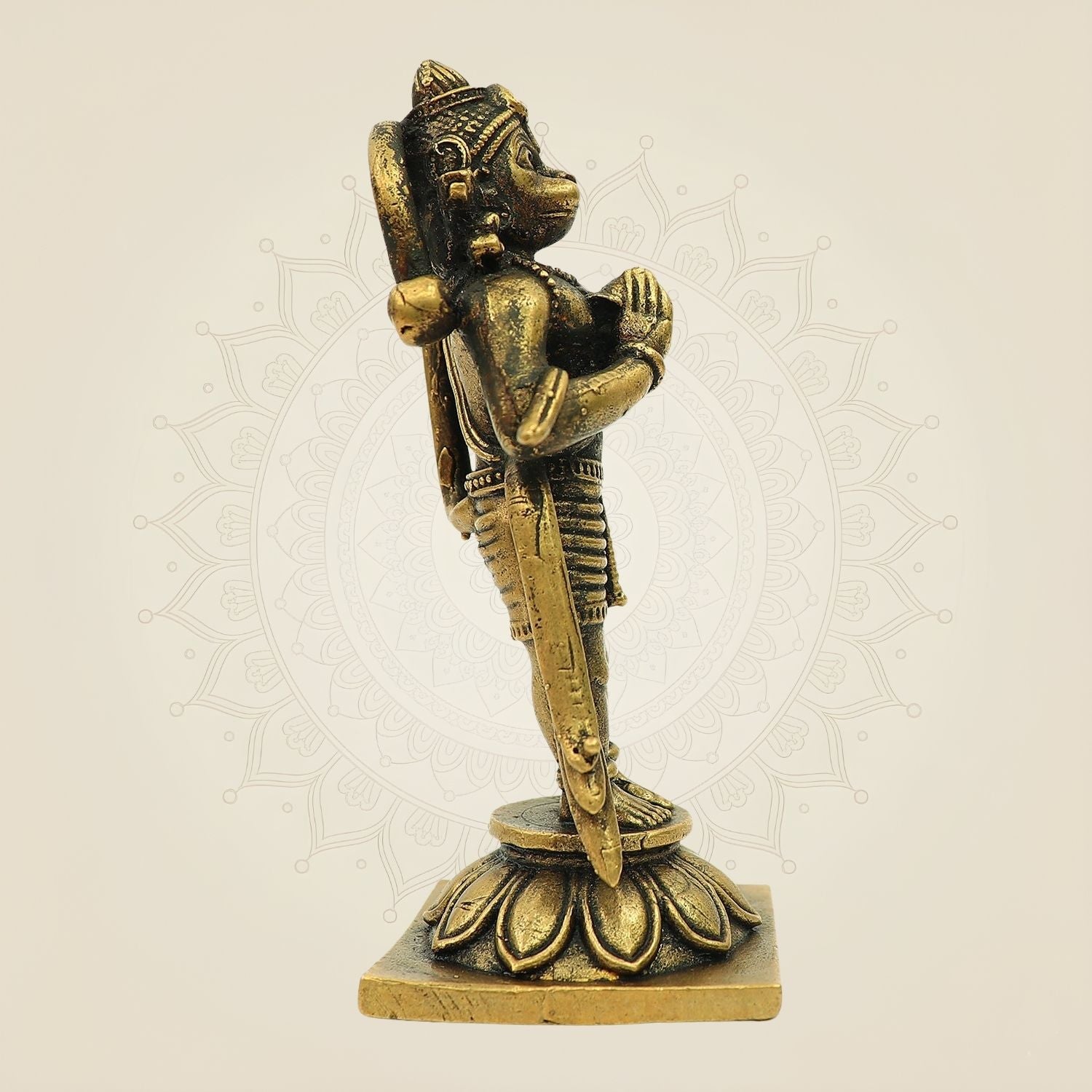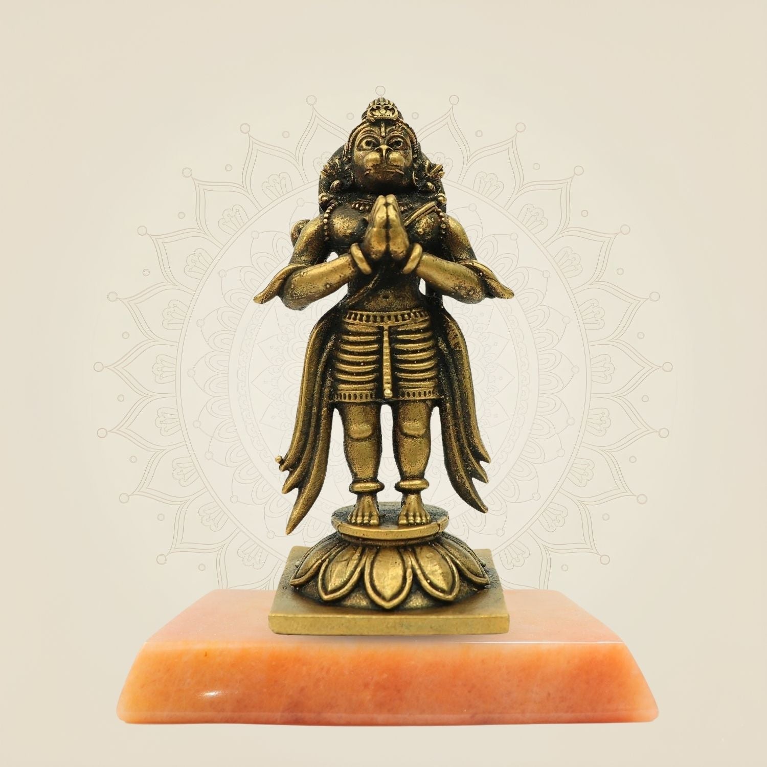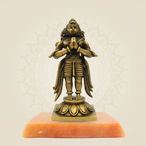Crafted from durable bronze, this 3.5-inch Hanuman idol captures the deity in the Anjali Mudra pose, symbolizing devotion and reverence. Its detailed artistry and compact size make it ideal for personal altars or sacred spaces, enhancing spiritual ambiance with its presence. A timeless piece for those seeking authentic devotional decor that combines tradition with lasting quality.