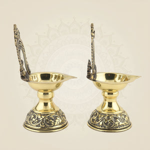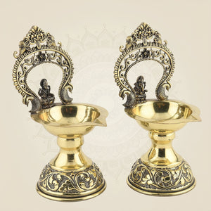The 5.5" Brass Laxmi Ganesh Diya Set is a finely crafted oil lamp designed for spiritual rituals and festive occasions. Made from superfine, lightweight brass, it features detailed representations of Goddess Laxmi and Lord Ganesh, embodying prosperity and wisdom. Its balanced, durable design offers ease of use while enhancing the sacred atmosphere during worship. Ideal for both traditional ceremonies and daily puja, this diya set merges timeless artistry with practical functionality.