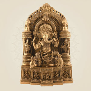 This exquisite 17.5-inch brass idol depicts Lord Ganesha as a musician, seated majestically alongside goddesses Lakshmi and Saraswati. Crafted with intricate detailing, the sculpture embodies prosperity, wisdom, and artistic inspiration. Its royal presence makes it an ideal centerpiece for spiritual spaces, enhancing both aesthetic and devotional significance. A timeless piece combining cultural heritage with artistic mastery.