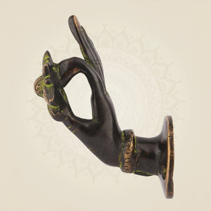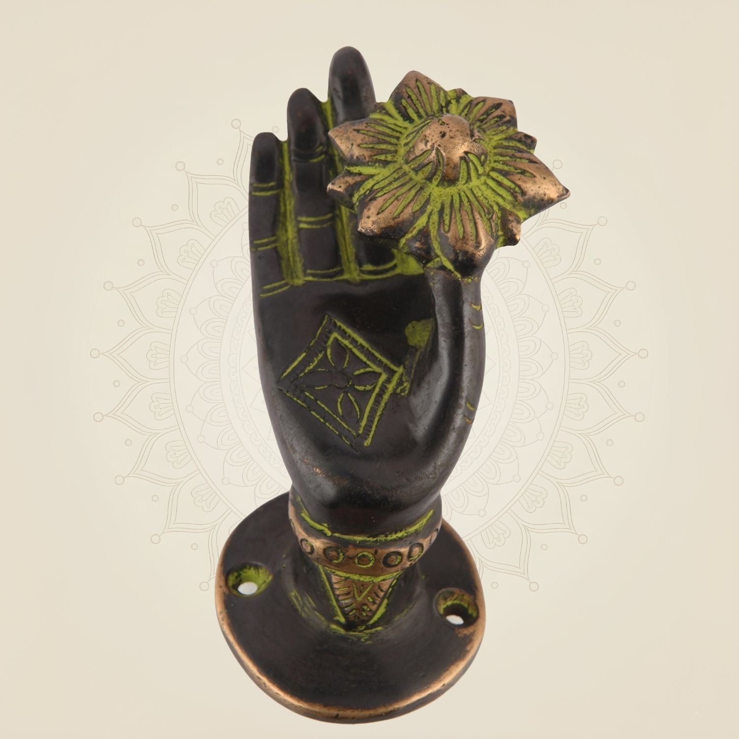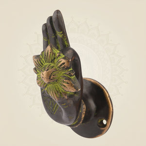 Antique Brass Buddha Door Handle 4.5" Hand Mudra with Lotus Design