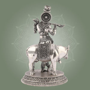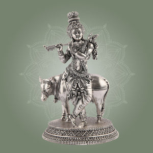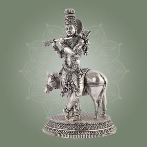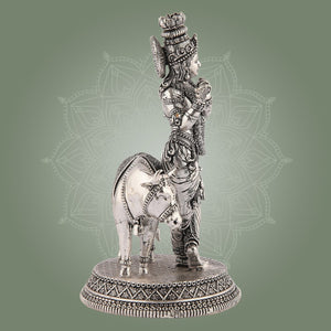 This finely handcrafted brass sculpture captures Lord Krishna alongside a cow, symbolizing compassion, nurturing, and protection. Measuring 6.75 inches with a silver finish, this detailed idol embodies the divine bond between the deity and nature, making it a meaningful addition for those seeking spiritual connection and artistic craftsmanship.