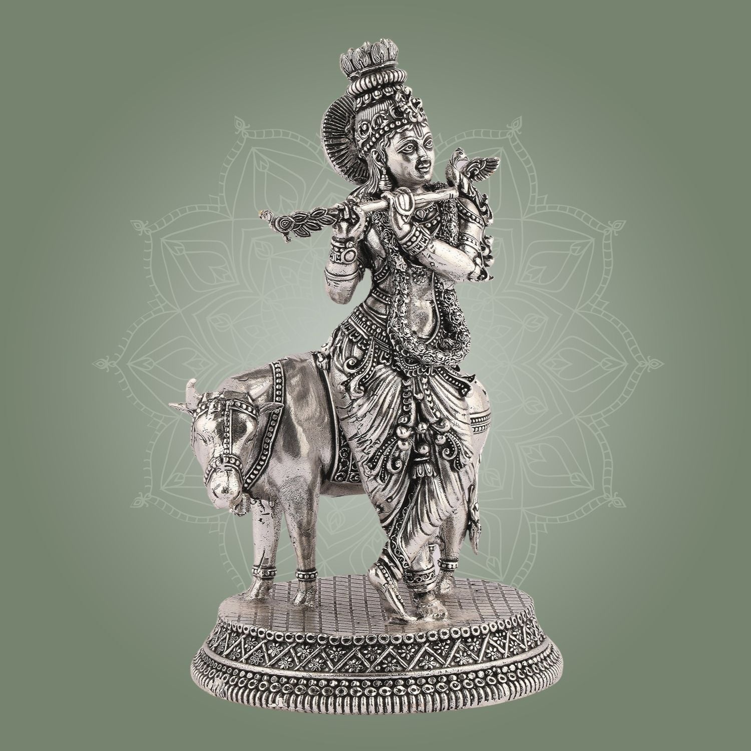Krishna with Cow Idol 6.75" Silver Finish Handcrafted Brass Sculptures