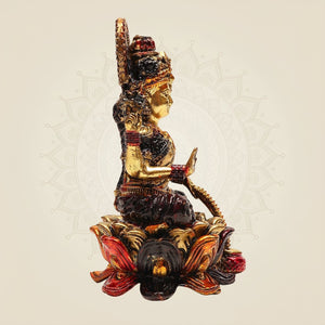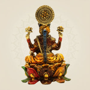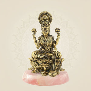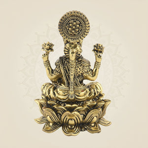 This 4.25-inch handcrafted brass statue of Laxmi Maa depicts the goddess seated gracefully on a lotus, symbolizing purity and prosperity. Expertly crafted, it serves as a meaningful addition to any space, invoking blessings of wealth and abundance through its traditional design and durable brass material. Ideal for both worship and decorative purposes, the statue embodies spiritual significance with refined artisan detail.