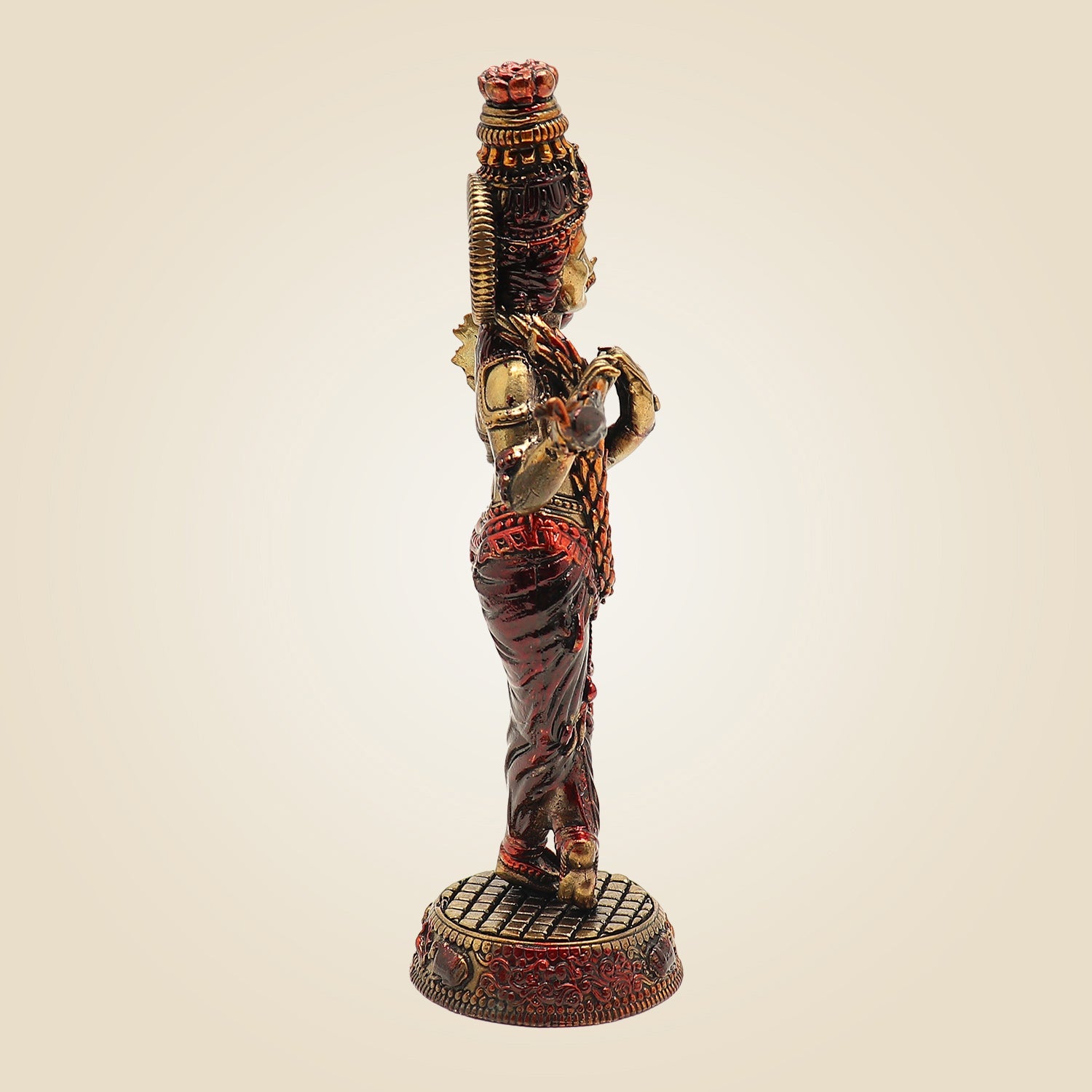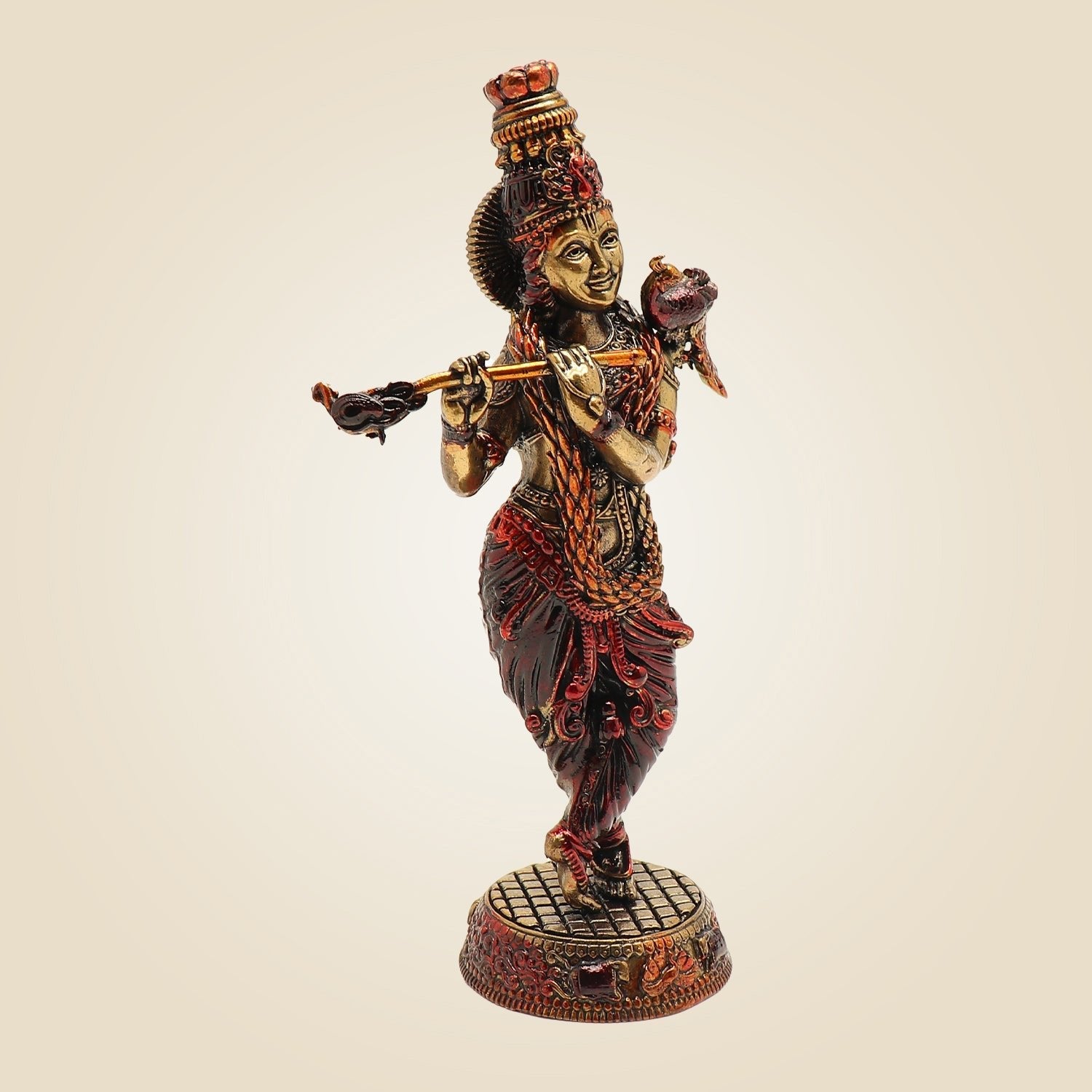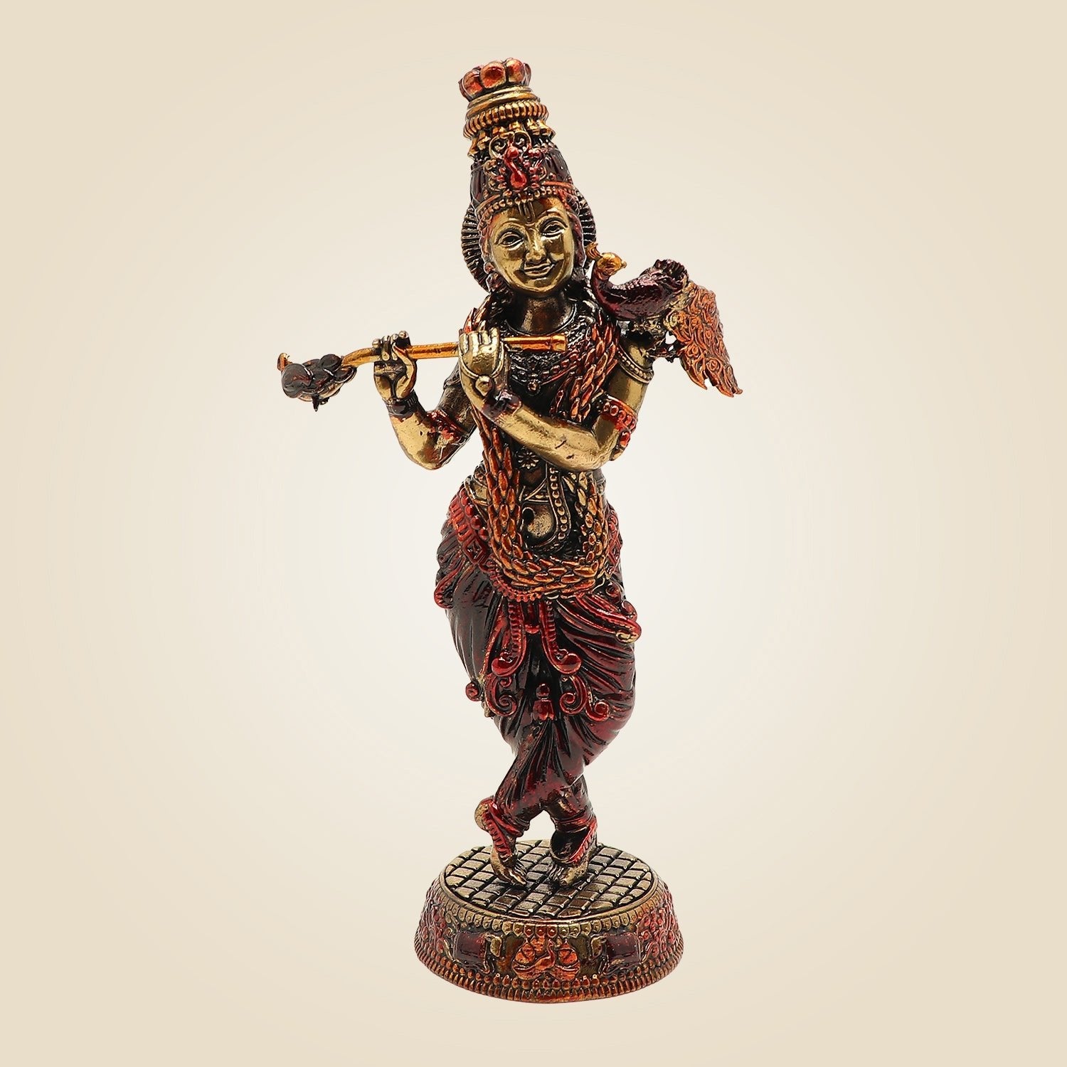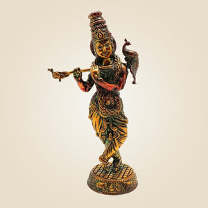This 6.5-inch pure brass statue of Lord Krishna with a peacock idol represents an exquisite craftsmanship merging tradition with divine symbolism. Expertly cast in solid brass, it captures the serene presence of Krishna alongside the vibrant peacock, symbolizing beauty and spirituality. Perfect for meditation or as a sacred décor piece, this masterpiece fosters a connection to divine energy and enriches any space with its timeless spiritual significance.