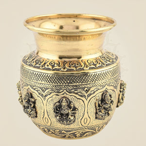 The Pure Brass Ashtalakshmi Kalash, measuring 5.5 inches, is a meticulously handcrafted piece ideal for pooja rituals and temple decoration. Its fine brass craftsmanship ensures durability and an authentic traditional look, making it a meaningful addition to your sacred space. Perfect for invoking the blessings of Goddess Ashtalakshmi, this kalash balances elegance with spiritual significance.