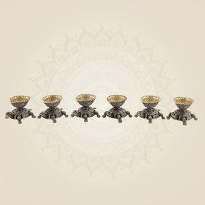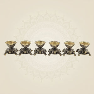Crafted from polished brass, this set of six tortoise-shaped oil lamps blends traditional artistry with refined elegance. Each 1.5-inch diya is ideal for pooja rituals or as a sophisticated décor accent, offering both spiritual significance and timeless charm. Their compact size and detailed design make them perfect for creating a serene ambiance in any space. Durable and easy to use, these lamps bring a subtle glow that enhances your sacred or decorative settings with expert craftsmanship.