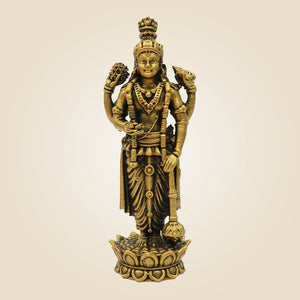 This 5-inch bronze Lord Vishnu idol features exquisite craftsmanship, depicting the deity standing gracefully on a lotus. Ideal for pooja decor, its detailed design symbolizes purity and divine presence, enhancing your sacred space with spiritual elegance. The durable bronze construction ensures lasting beauty, making it a timeless addition to any altar or devotional setting.