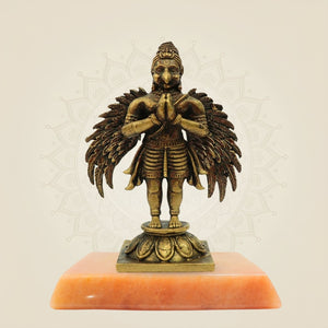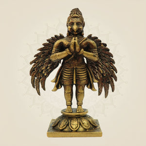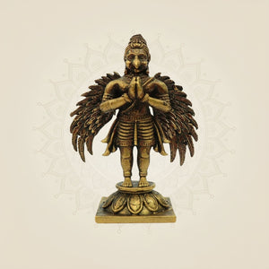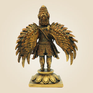 Crafted with meticulous detail, this 3.25-inch Bronze Garuda Idol represents the revered vahana of Lord Vishnu. Handmade by skilled artisans, the sculpture captures Garuda’s dynamic posture and intricate features, embodying strength and devotion. Its compact size makes it ideal for personal altars or as a distinguished decorative piece, connecting spiritual symbolism with exquisite craftsmanship.