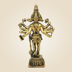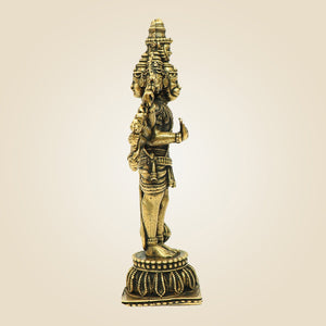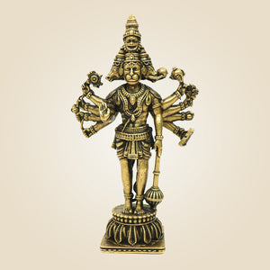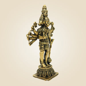 This 4.5-inch bronze Panchmukhi Hanuman idol, crafted with expert precision, symbolizes strength and protection. Featuring five faces representing different forms of Hanuman, this standing murti is ideal for personal altars or sacred spaces, inviting divine safeguarding and spiritual balance into your environment. Its compact size suits both home and office settings while maintaining a powerful presence.