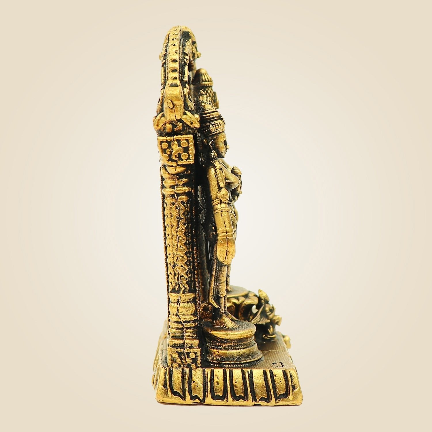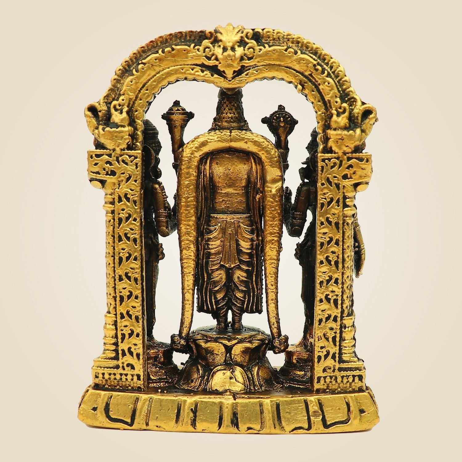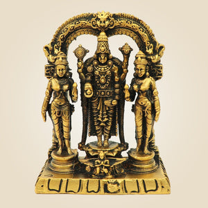 This finely crafted 2.75-inch bronze idol depicts Lord Venkateswara alongside Sridevi and Bhudevi, embodying divine grace and spiritual significance. The detailed artistry highlights traditional iconography, making it ideal for personal worship or as a meaningful gift. Its compact size allows for easy placement on altars or desks, bringing a serene and sacred presence to any space. Durable bronze ensures lasting beauty and reverence in your devotional practice.