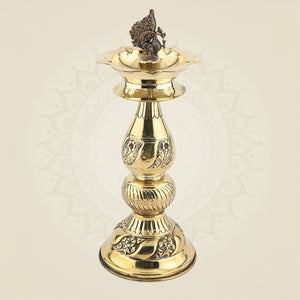 Elevate your pooja space with the Peacock Brass Diya Lamp, an 11-inch handcrafted traditional deepak designed for both ritual use and elegant décor. Expertly crafted from durable brass, this lamp features intricate peacock motifs symbolizing beauty and spirituality. Its finely...