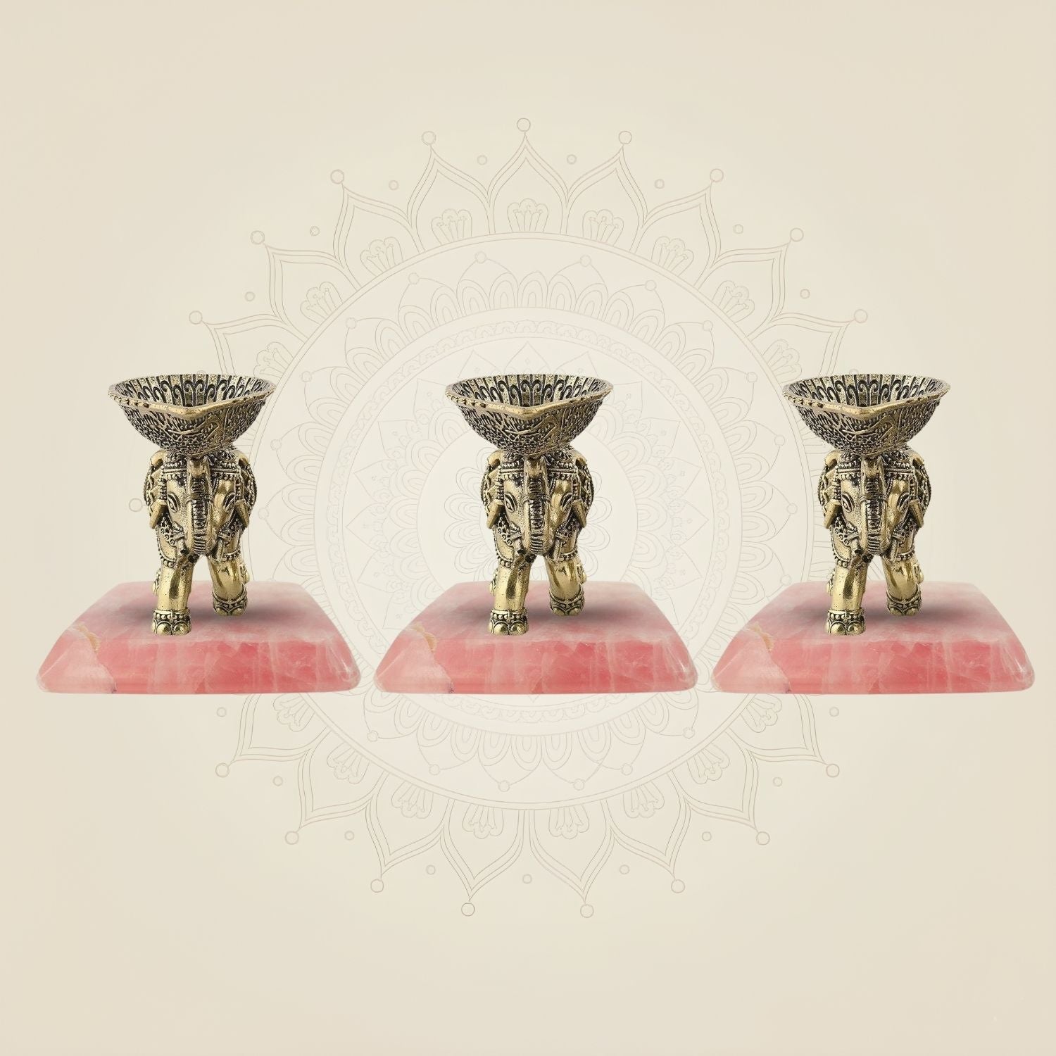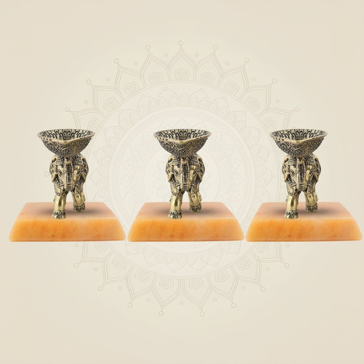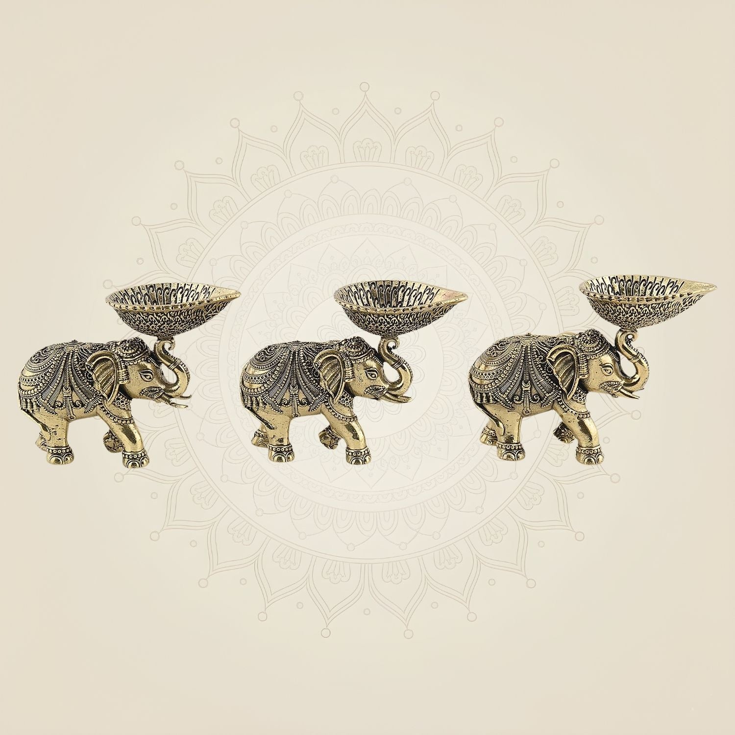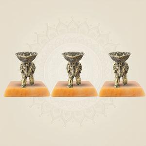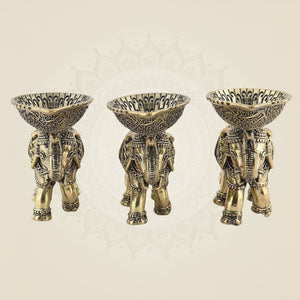 Crafted from durable brass, this set of three 3.5-inch Elephant Diyas features intricately designed oil lamps gracefully mounted on the trunks of elephant motifs. Perfect for traditional ceremonies or home decor, these diyas combine cultural symbolism with practical use, providing a steady, warm glow that enhances any setting. Their compact size and sturdy construction make them ideal for both decorative and ritual purposes.