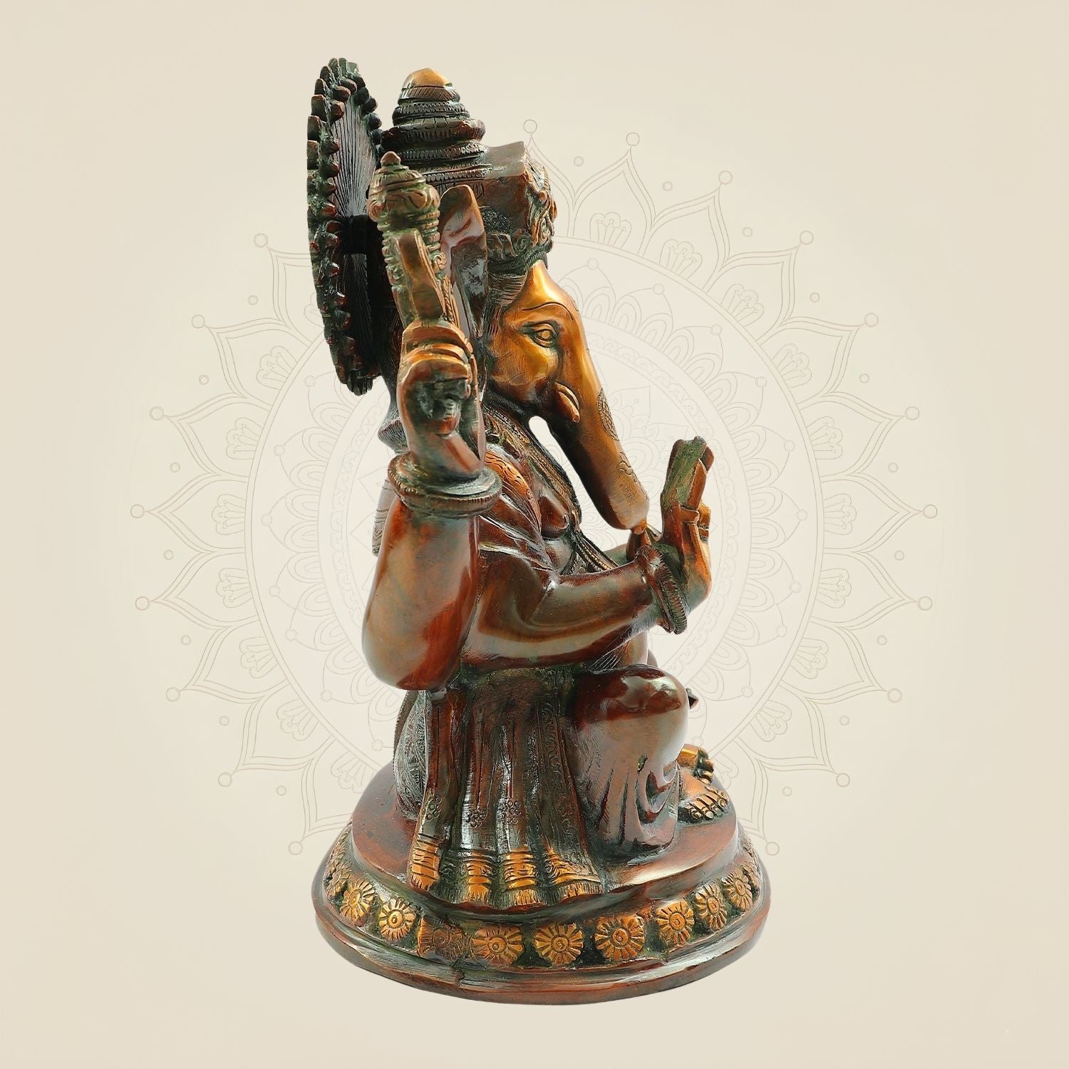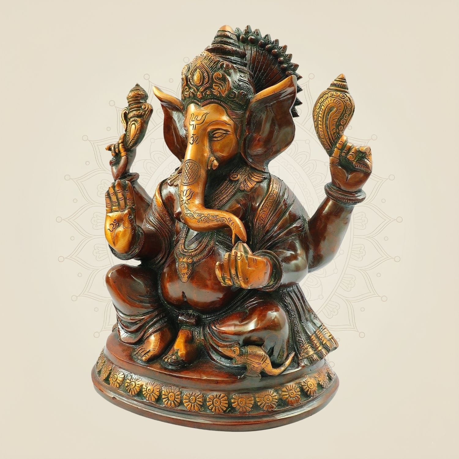 Crafted with meticulous detail, this 12-inch brass Lord Ganesha statue embodies timeless spiritual significance. Handmade by skilled artisans, it serves as a revered temple idol that invites blessings, wisdom, and prosperity into any space. Its durable brass construction ensures longevity, making it a lasting centerpiece for prayer and meditation. Ideal for devotees and collectors alike, this statue reflects expert craftsmanship and profound cultural heritage.