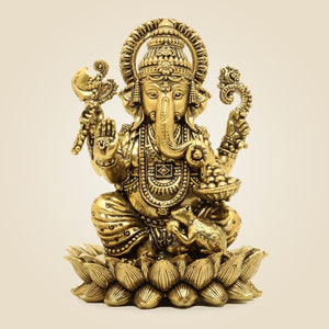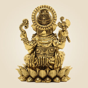 The Chaturbhuj Ganesh Idol, standing 4.75 inches tall, is meticulously handcrafted from pure brass by skilled artisans. This detailed murti captures the divine form with four arms, symbolizing wisdom, protection, and prosperity. Its solid brass composition ensures durability and a radiant finish that enhances any sacred space. Ideal for worship or as a spiritual centerpiece, this idol brings both aesthetic elegance and traditional significance to your home or temple.