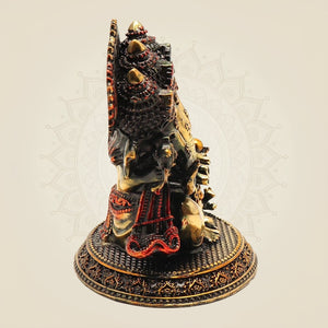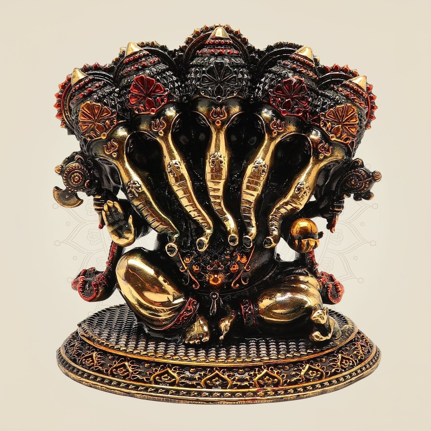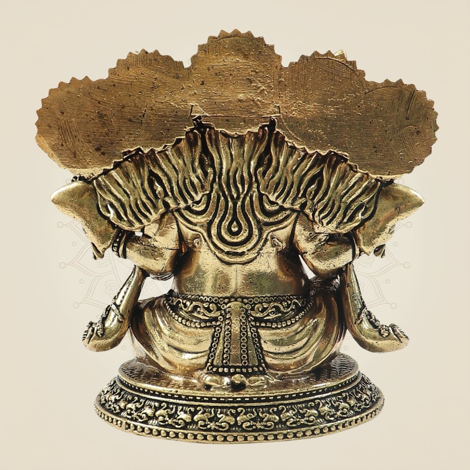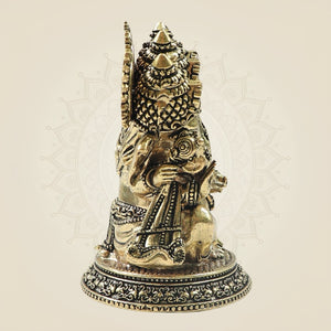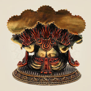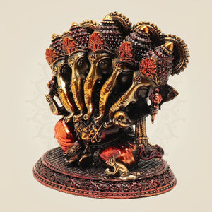 This finely crafted Panchmukhi Ganesh brass statue, standing 4.25 inches tall, features intricate detailing on an elegant oval base. Symbolizing wisdom and protection, this traditional piece enhances any space with spiritual significance and artistic refinement. Its durable brass construction ensures lasting beauty, making it ideal for both personal altars and decorative displays.
