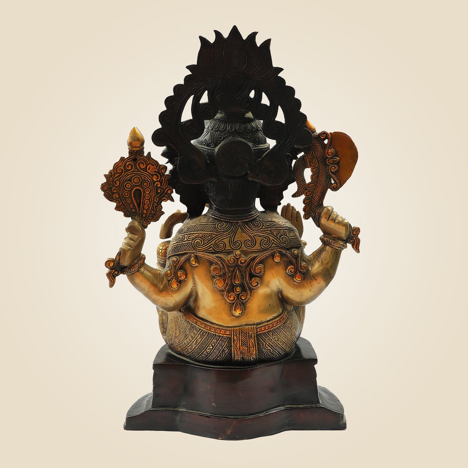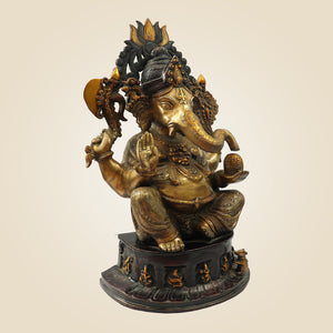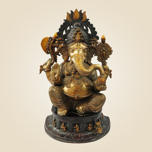 This exquisite 22.25" seated Chaturbhuja Lord Ganesha idol is meticulously crafted from brass, reflecting expert handmade artistry. Designed for temple or home sanctuaries, it embodies traditional iconography with four arms symbolizing divine powers. Its detailed craftsmanship ensures both aesthetic appeal and spiritual significance, making it an ideal centerpiece for devotion and meditation. Durable and rich in cultural heritage, this statue offers a timeless addition to any sacred space.