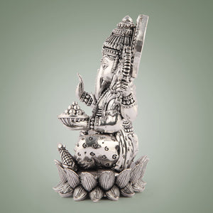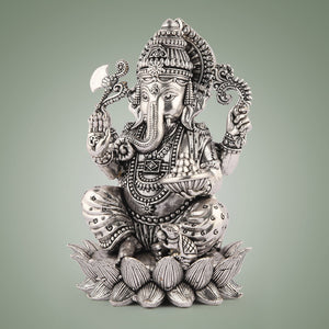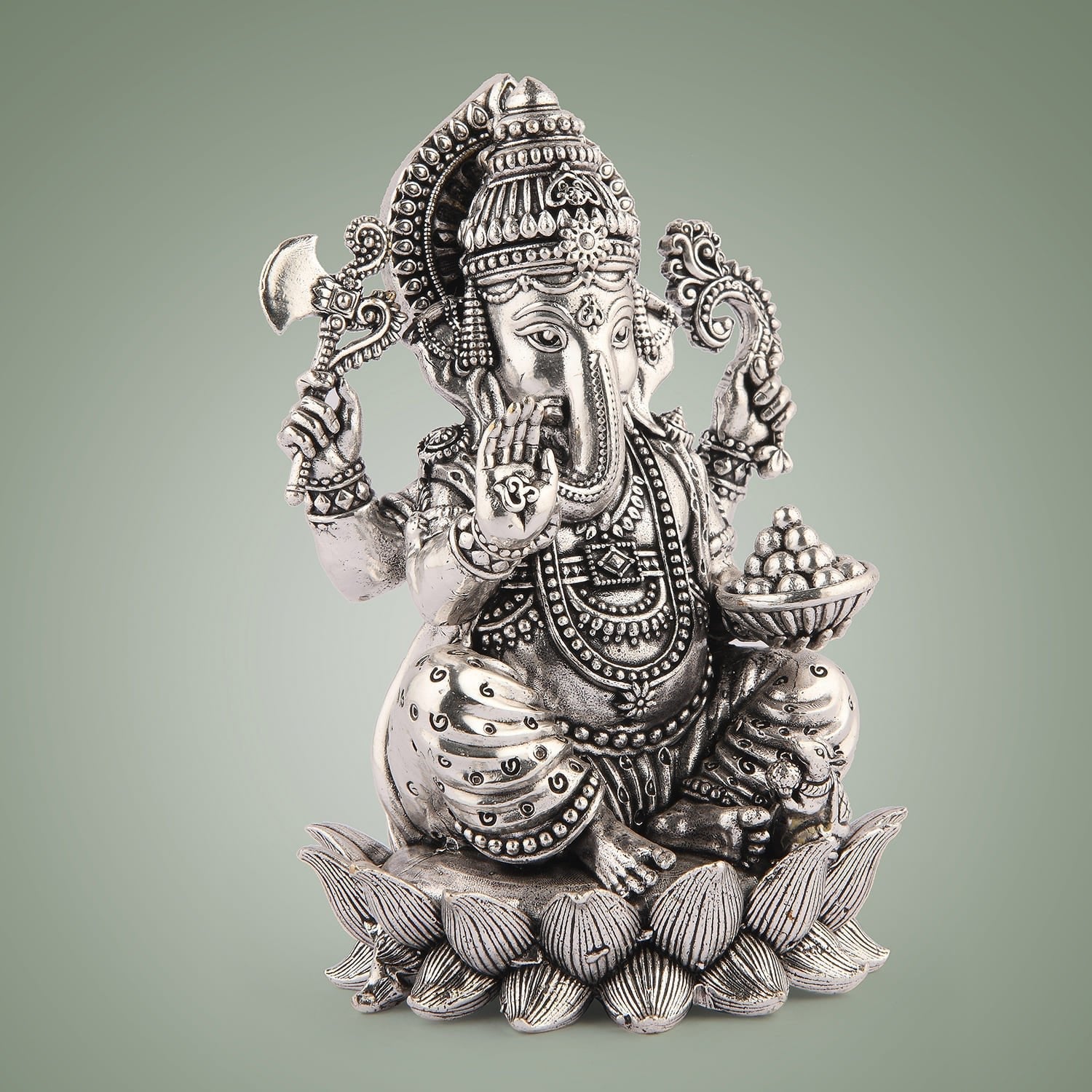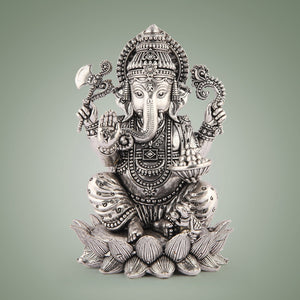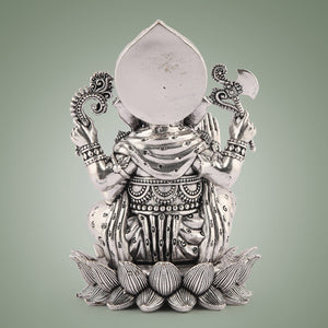 Celebrate auspicious occasions like Ganesh Chaturthi, Diwali, and housewarmings with this 4" silver-plated Lord Ganesha idol crafted from superfine pure brass. The detailed design of Ganesha seated on a lotus symbolizes purity, prosperity, and new beginnings, making it a meaningful addition to your sacred space. Its elegant finish adds a refined touch, perfect for inviting divine blessings during festive and important moments.