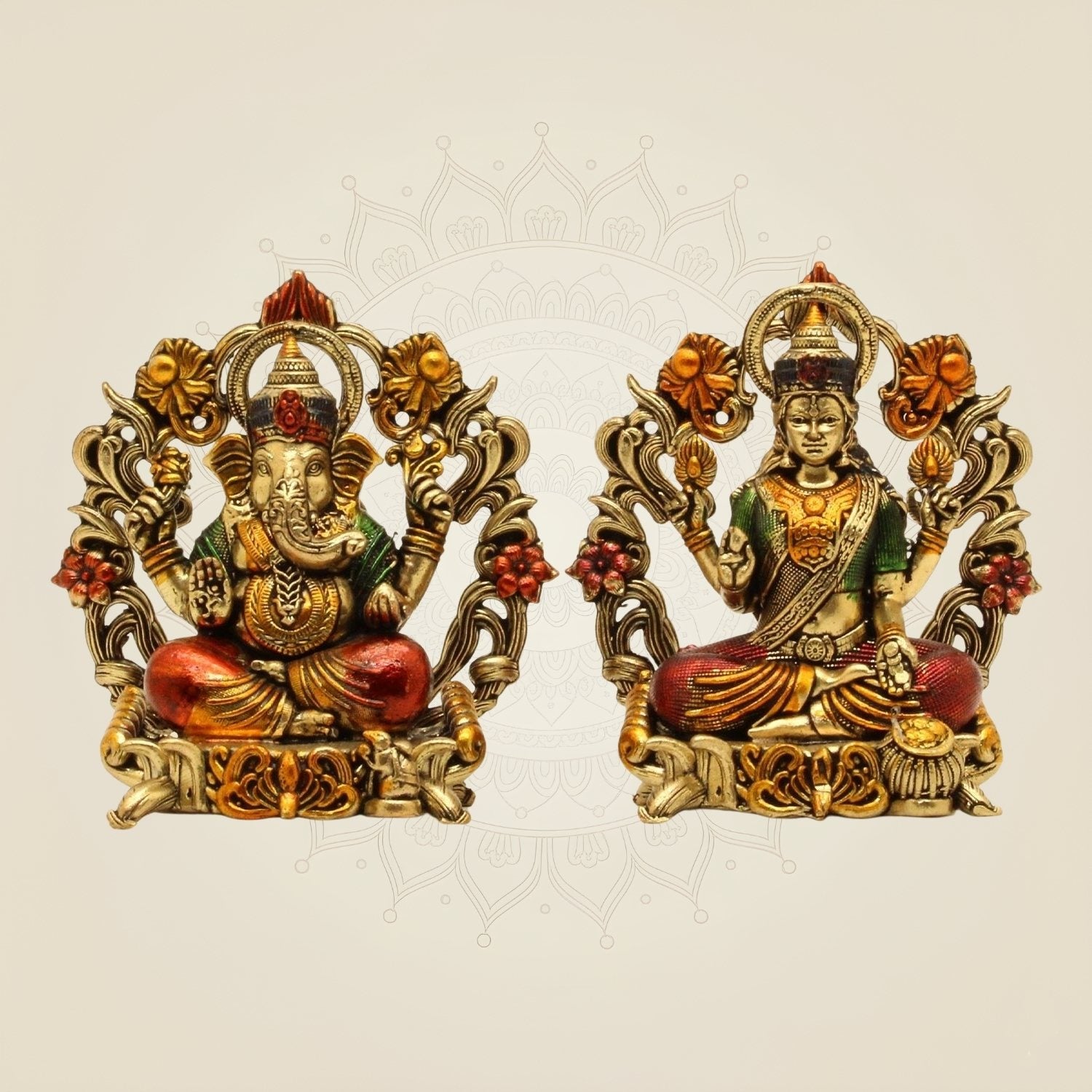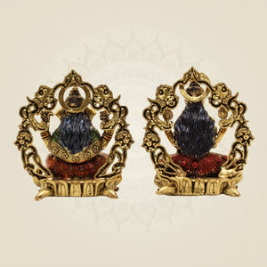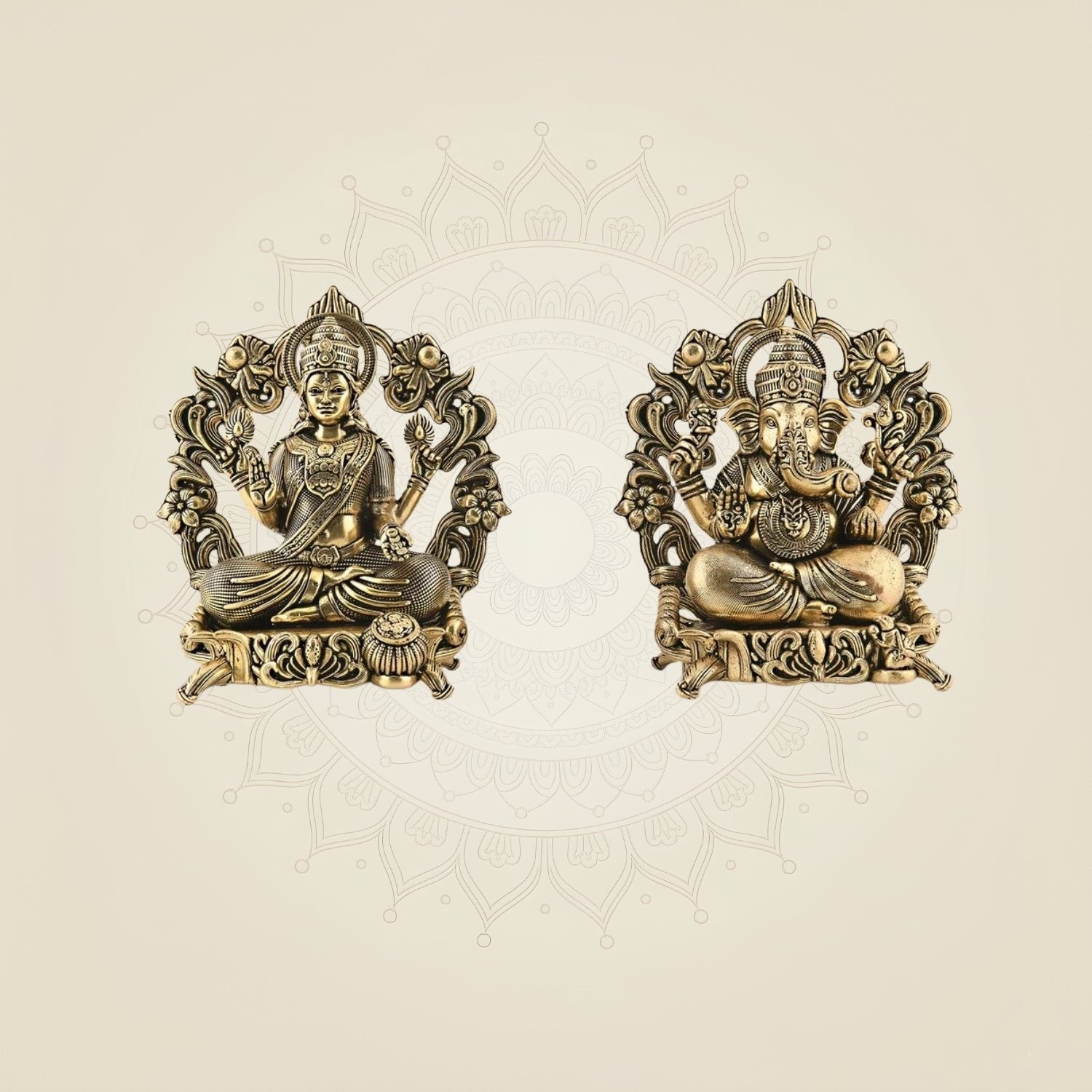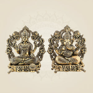 This exquisite 3.75" brass statue of Lakshmi Ganesh showcases both deities seated gracefully on a lotus aasan, symbolizing prosperity and wisdom. Crafted with precision, it is ideal for home temples and Diwali pooja rituals, enhancing spiritual ambiance while serving as a durable and elegant piece for daily worship. Its compact size makes it perfect for intimate sacred spaces.