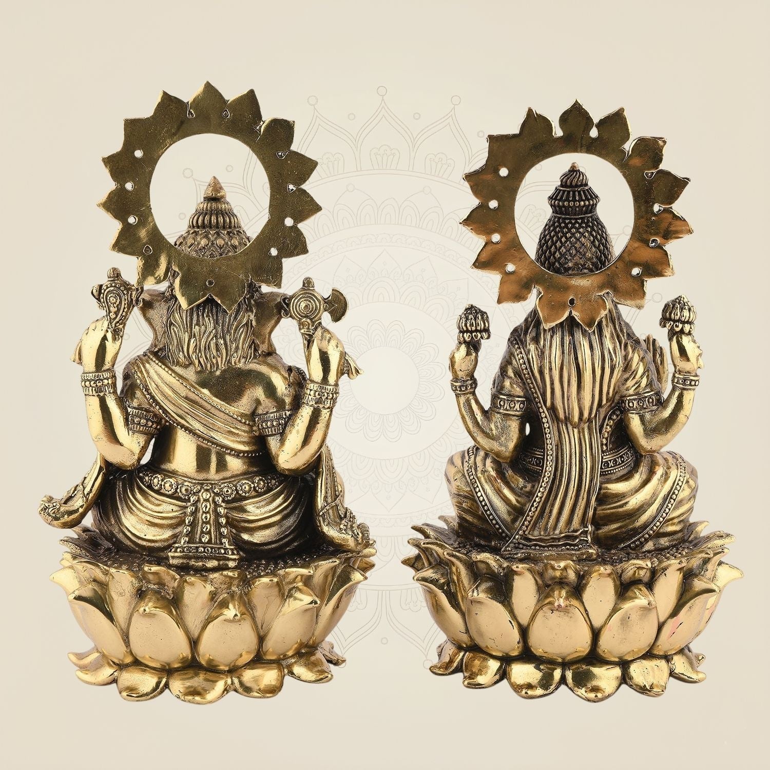 This 6-inch handcrafted brass idol beautifully depicts Lakshmi and Ganesh seated on a lotus, symbolizing prosperity and wisdom. Crafted with superfine detail, this divine murti serves as an authentic spiritual centerpiece to invite wealth and auspiciousness into any space. Its traditional design and durable brass make it a lasting and meaningful addition for devotees and collectors alike.