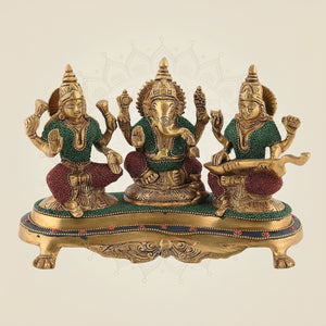 This 6.5-inch brass idol features Goddess Laxmi, Lord Ganesh, and Goddess Saraswati, symbolizing wealth, wisdom, and prosperity. The stone finish enhances its traditional appeal while ensuring durability. Ideal for home altars or office spaces, this murti brings spiritual balance and positive energy to your surroundings with expert craftsmanship reflecting timeless cultural heritage.