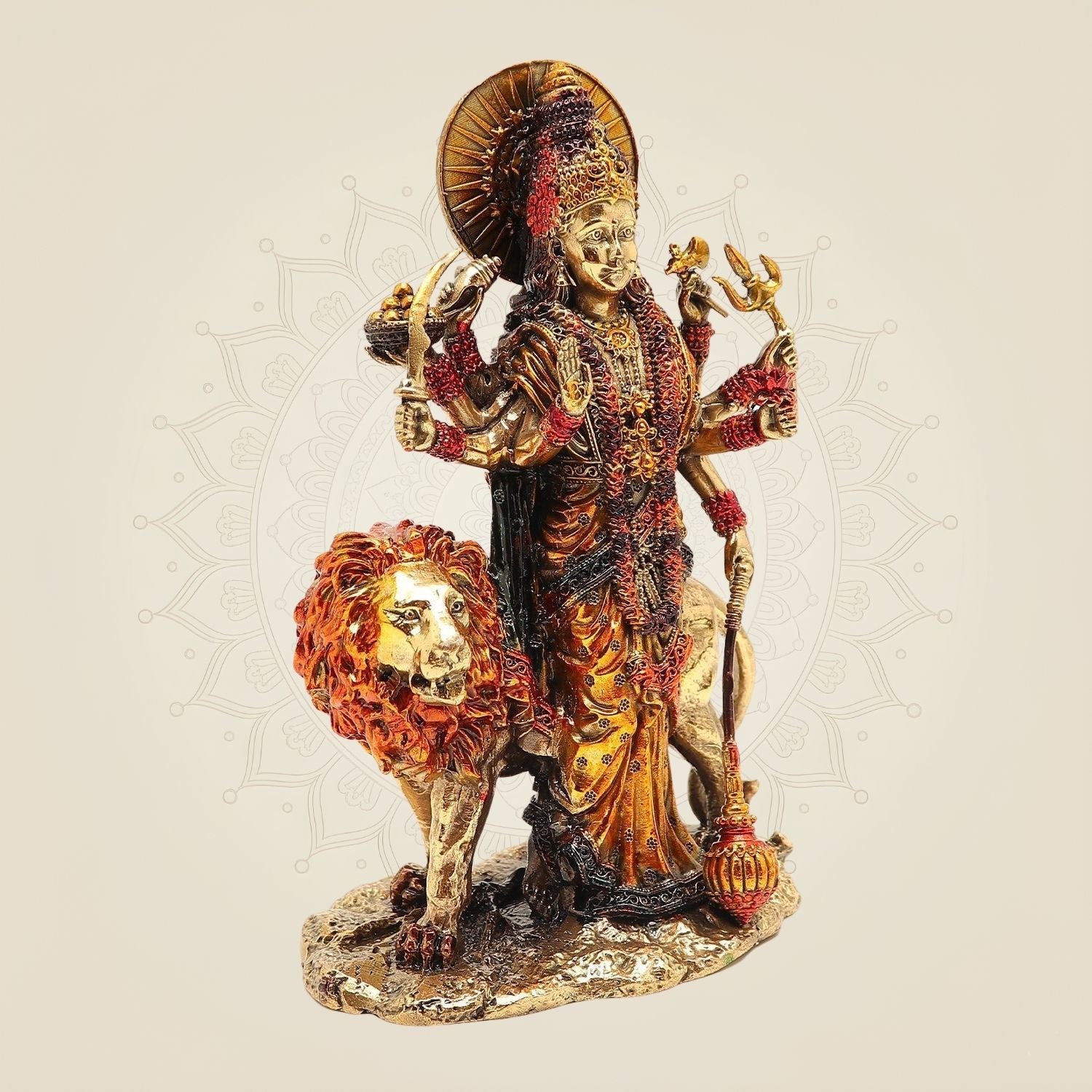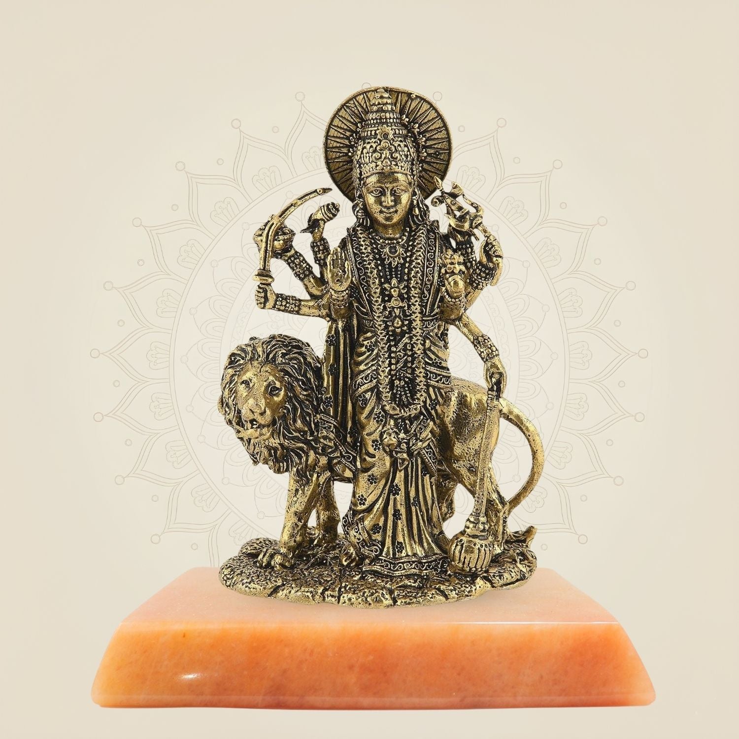 This 5-inch Durga Maa brass idol captures the essence of divine strength and grace. Expertly handcrafted, it portrays Goddess Durga seated confidently on her lion, symbolizing courage and protection. The detailed brass carving adds a timeless charm, making it an ideal piece for spiritual spaces or as a meaningful gift for devotees. Crafted with precision, this sculpture enhances both devotion and interior decor with its sacred presence.