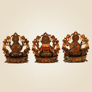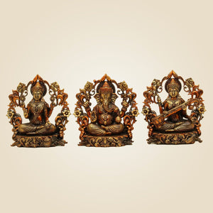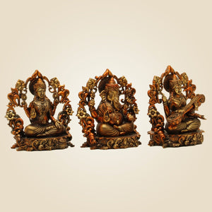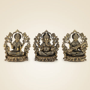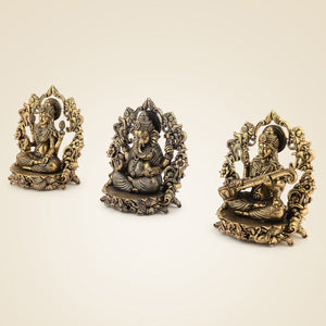 This 3.75" handcrafted brass idol features the revered deities Laxmi, Ganesh, and Saraswati together, embodying wealth, wisdom, and prosperity. Expertly cast with fine detailing, this murti serves as a meaningful addition to your sacred space or office, inviting positive energy and spiritual harmony into your surroundings. Its compact size makes it ideal for both personal altars and gifting.