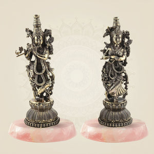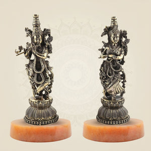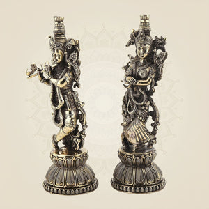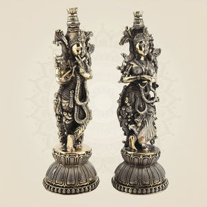 This 8.5-inch Radha Krishna Leela idol is crafted from pure brass, capturing the divine essence of their eternal love and devotion. The detailed figurine portrays the timeless scene of Radha and Krishna in a graceful pose, embodying spiritual harmony and artistic finesse. Ideal for meditation spaces or as a refined decorative piece, this idol brings a serene and sacred presence to any environment. Its durable brass construction ensures longevity while highlighting intricate craftsmanship treasured in traditional devotional art.