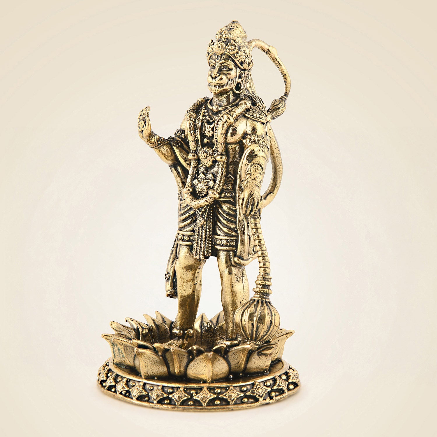 This exquisitely handcrafted 4-inch brass Hanuman idol stands gracefully on a lotus, symbolizing purity and divine energy. Meticulously carved with superfine details, it serves as a powerful emblem of strength, protection, and positivity. Ideal for creating a serene spiritual ambiance in your home or office, this durable brass figure is designed to inspire devotion and bring a sense of calm focus to your daily rituals.