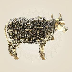 This exquisite 3-inch brass statue of the Kamadhenu cow captures the essence of divine symbolism in your home. Crafted with precision, this artwork embodies prosperity and spiritual grace, making it a perfect addition to your sacred space or décor. Its compact size and detailed design ensure it fits seamlessly into any setting, offering both aesthetic appeal and cultural significance. Ideal for those seeking a meaningful artifact with timeless beauty and expert craftsmanship.