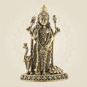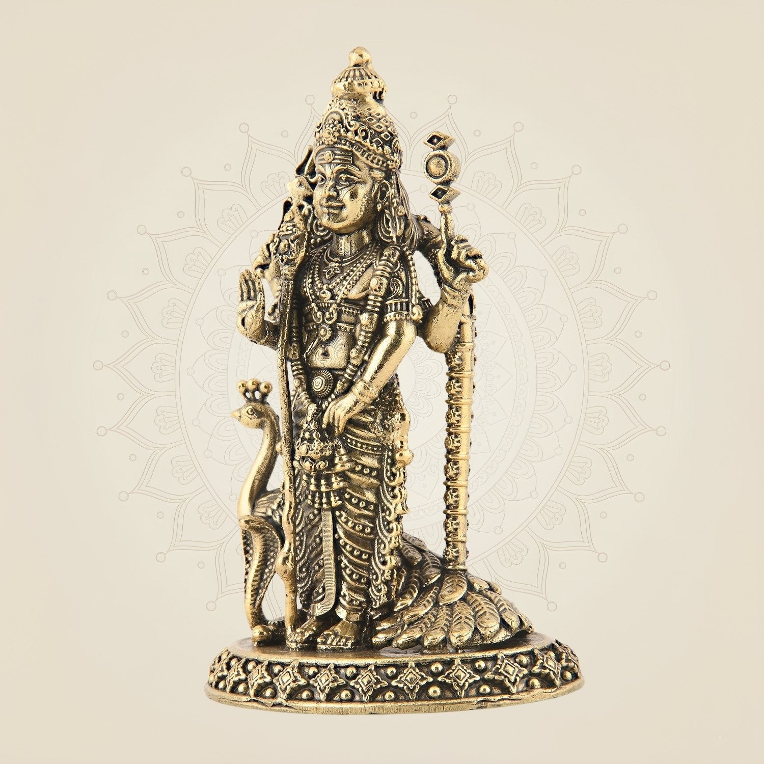 This 5-inch handcrafted brass idol of Lord Murugan captures the divine presence of Kartikeya, the revered Hindu deity, in intricate detail. Featuring a standing posture alongside his symbolic peacock, the statue embodies tradition and spiritual significance. Perfectly suited for home altars or meditation spaces, this brass piece offers both artistic craftsmanship and a meaningful focal point for devotion. Its durable brass construction ensures lasting beauty and heritage appeal.