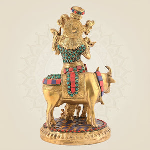 Brass Krishna with Cow Idol - Multicolor Gemstone Work - Handcrafted Murti 10"