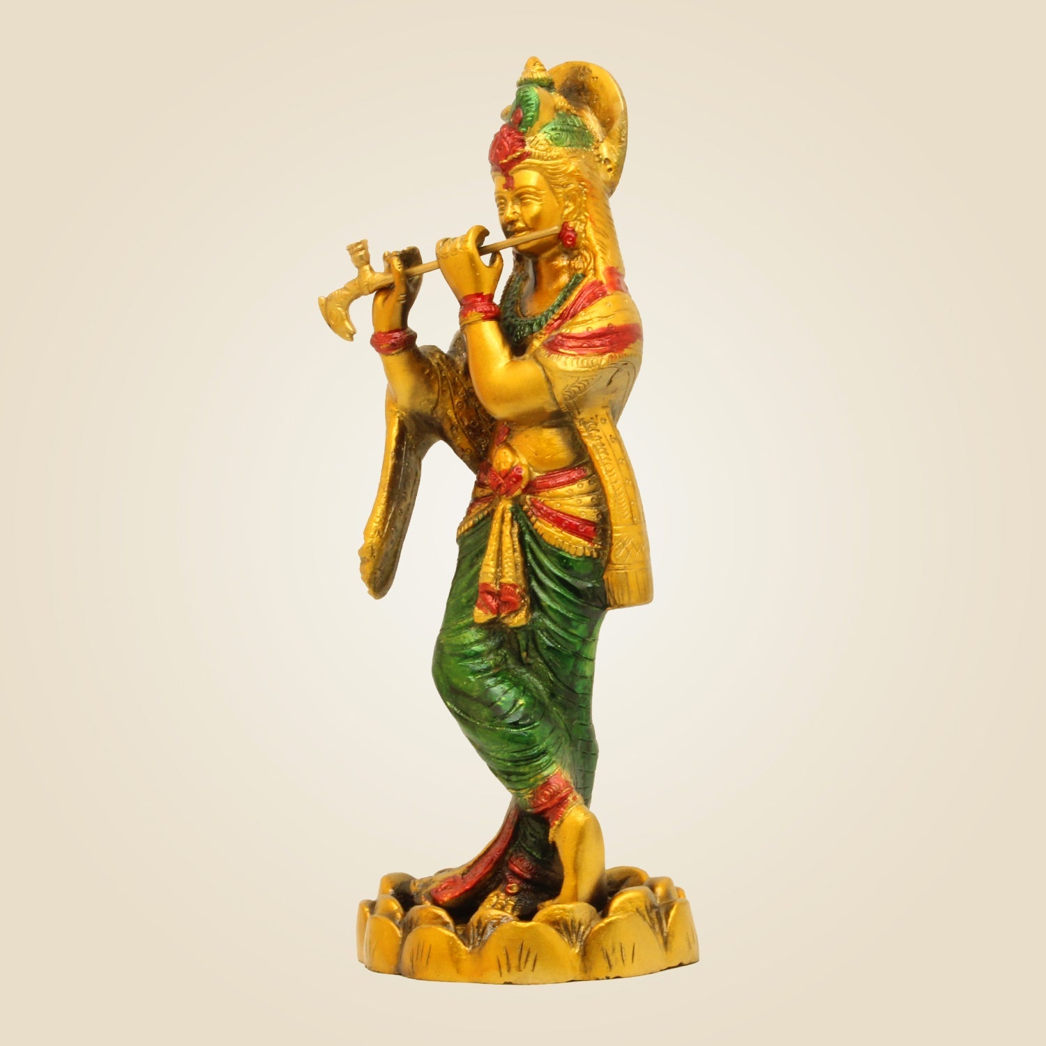 Hand-Painted Brass Krishna Idol 10.25"– Flute Playing Murti for Mandir or Gift