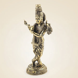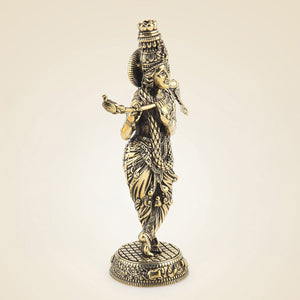This 9.5-inch handcrafted brass idol of Krishna captures the deity in a graceful flute-playing pose, symbolizing divine music and serenity. Meticulously crafted with intricate detailing, it features a decorative base that enhances its presence as a centerpiece. Ideal for spiritual spaces or as a refined art piece, this Murti embodies tradition and artistic excellence, offering both devotional significance and timeless elegance.