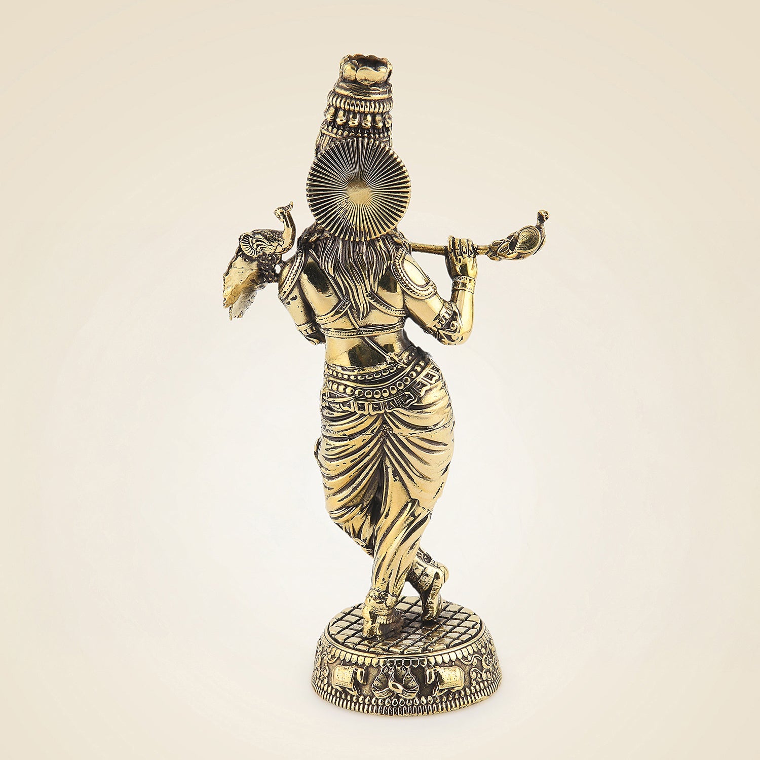 Handcrafted Krishna Brass Idol 9.5" - Flute Player Murti with Decorative Base