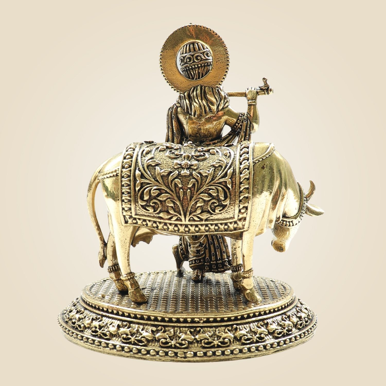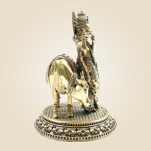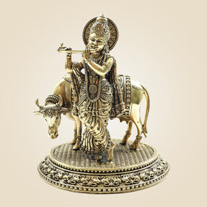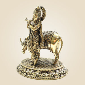 Krishna with Cow Brass Idol – Flute Playing Divine Murti - 5"