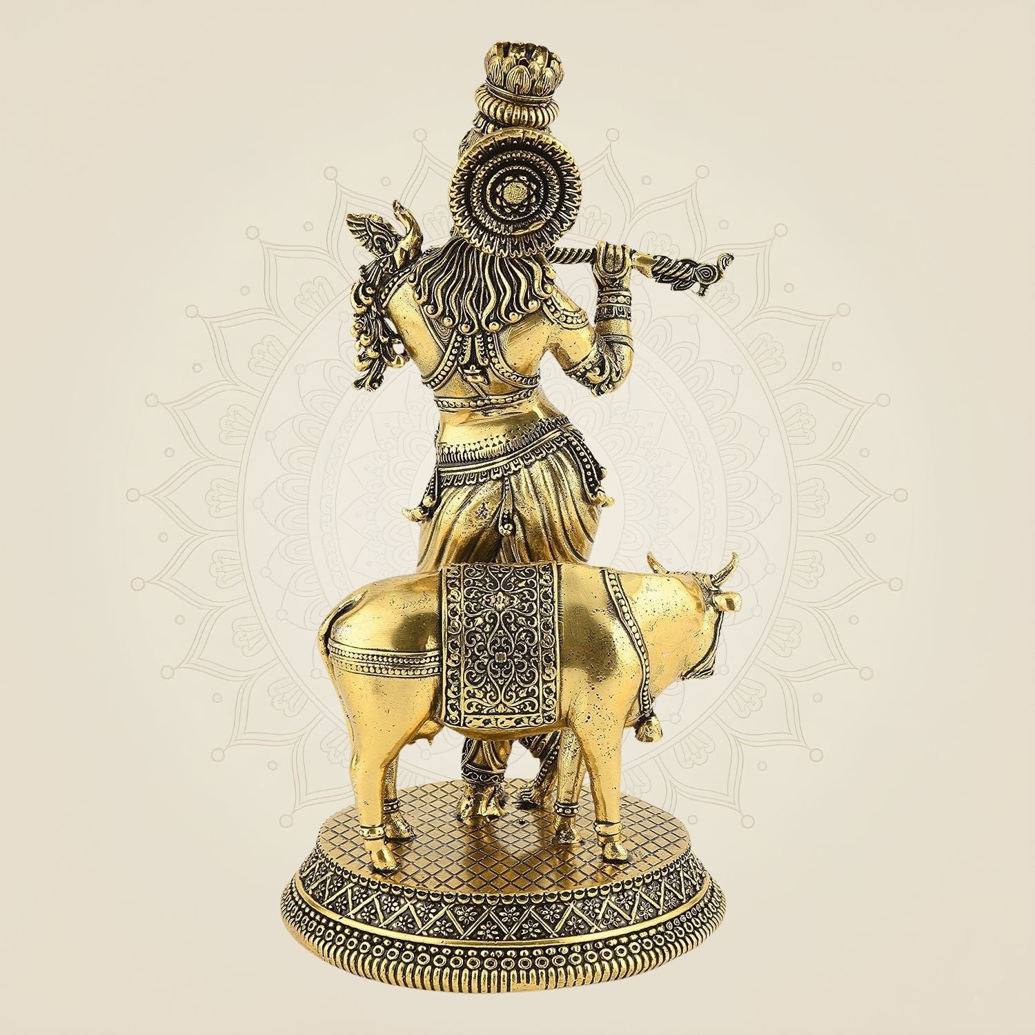 This 8-inch handcrafted brass murti of Lord Krishna with a cow captures the essence of devotion and spirituality. Meticulously crafted, it highlights fine details that reflect traditional artistry, making it a meaningful gift or a distinguished addition to your sacred space. The brass material ensures durability and a timeless appeal, fostering a serene and divine atmosphere wherever displayed. Ideal for collectors and devotees alike, this idol serves both as a symbol of faith and an elegant decor piece.
