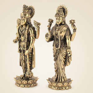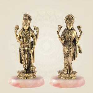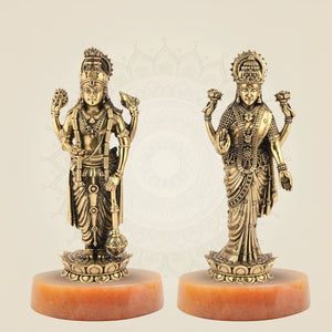 This 5" brass Lakshmi Vishnu idol features exquisite craftsmanship, resting on an elegant lotus base. Ideal for puja rituals and decorative purposes, it combines spiritual significance with artistic detail. The durable brass ensures longevity, making it a meaningful addition to your sacred space or home decor.
