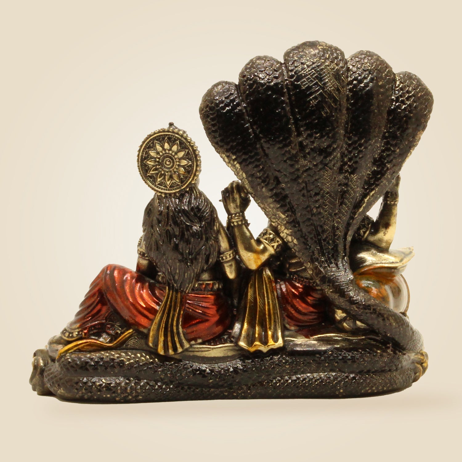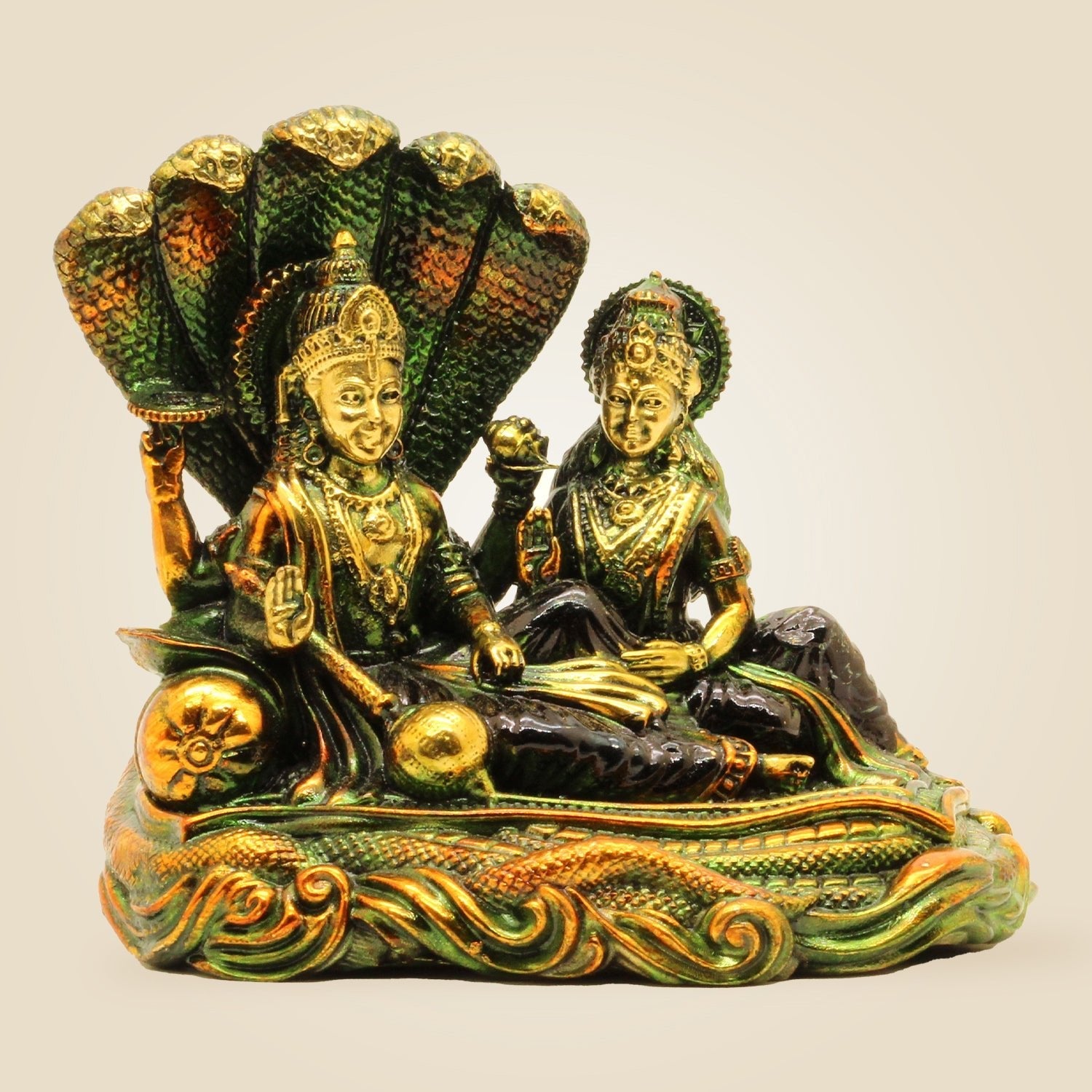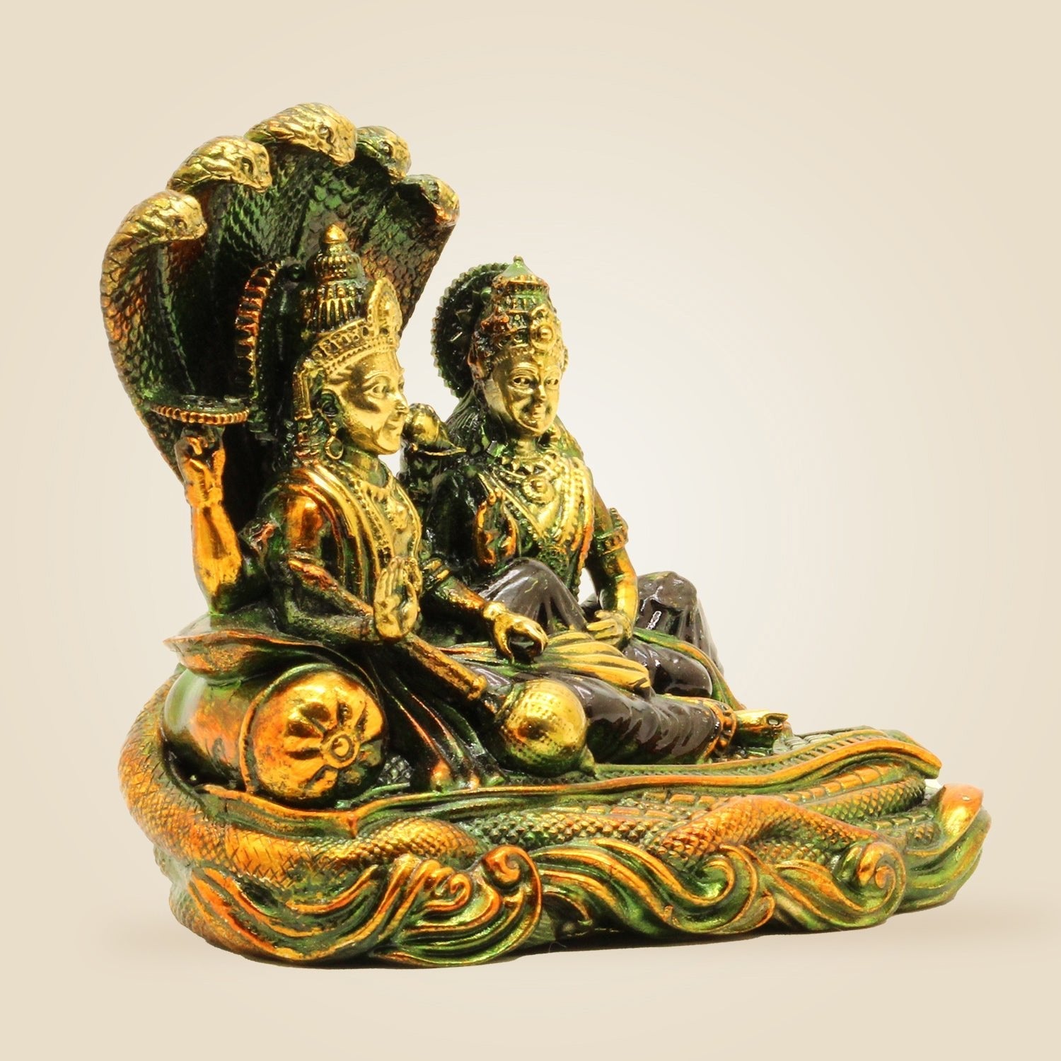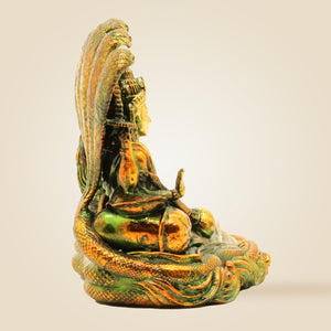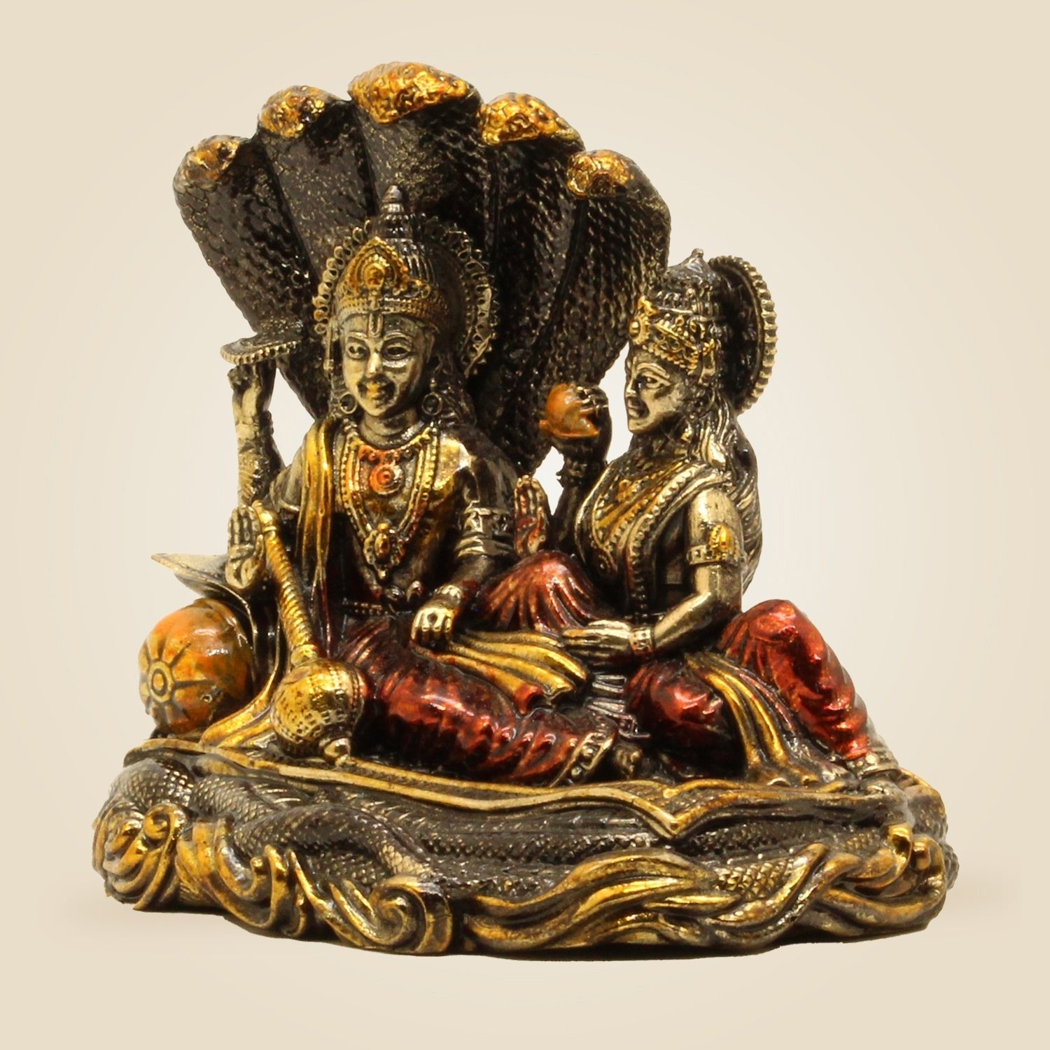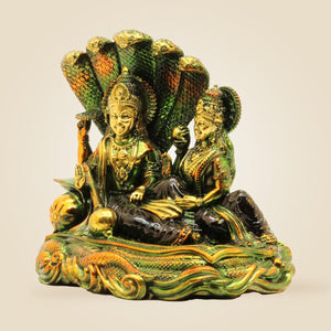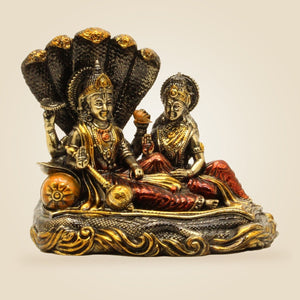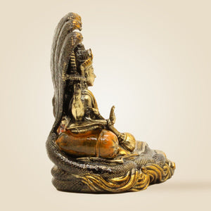 This finely crafted 4.75" brass idol of Lakshmi Narayana seated on Sheshnag embodies divine blessings for prosperity and well-being. Ideal for pooja rituals, it combines exquisite artistry with spiritual significance, making it a timeless addition to your sacred space that invites abundance and harmony into your home or workplace.