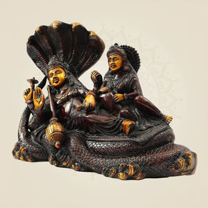 This exquisite 9.5-inch handcrafted brass statue depicts Vishnu and Laxmi seated on the majestic Sheshnag. Meticulously crafted by skilled artisans, it embodies traditional craftsmanship and spiritual symbolism. Perfect for enhancing your sacred space, this idol serves as a meaningful centerpiece that fosters devotion and tranquility. Its durable brass construction ensures longevity, making it a timeless addition to your collection.