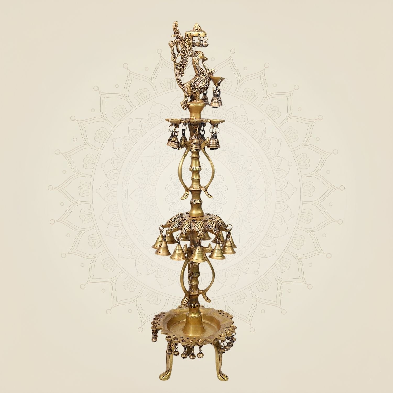 Handmade 34" Large Brass Peacock Diya with Hanging Bells & Ghungroos