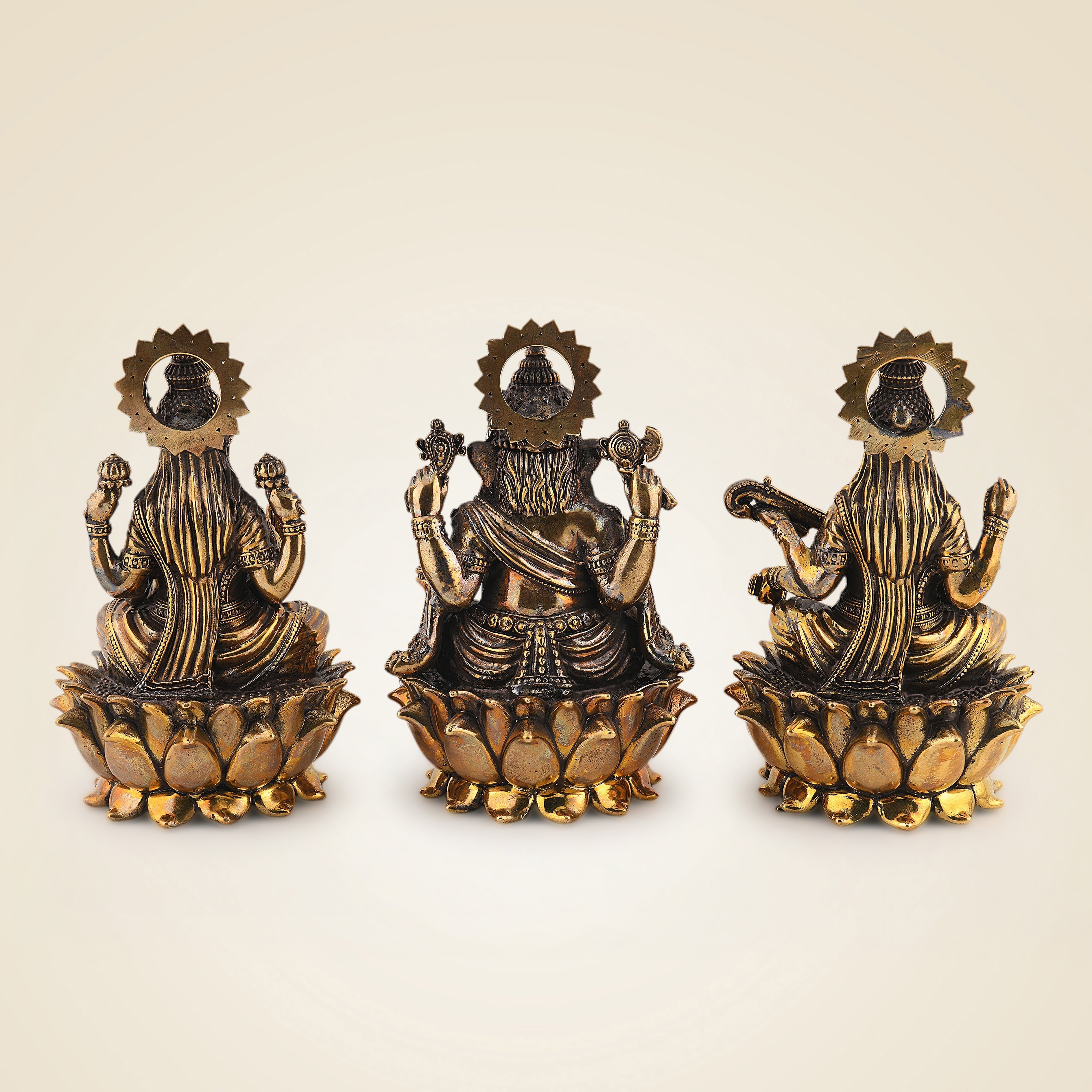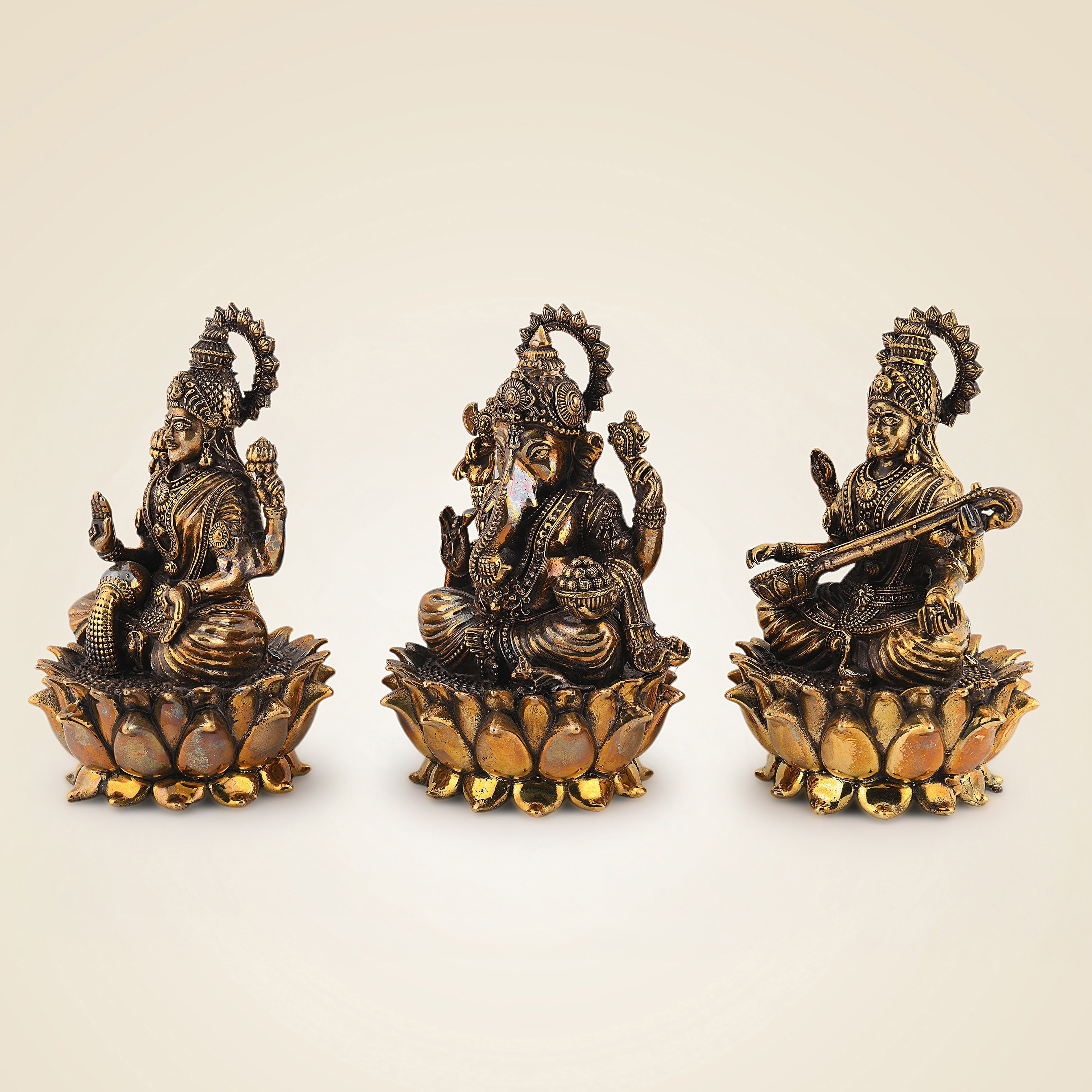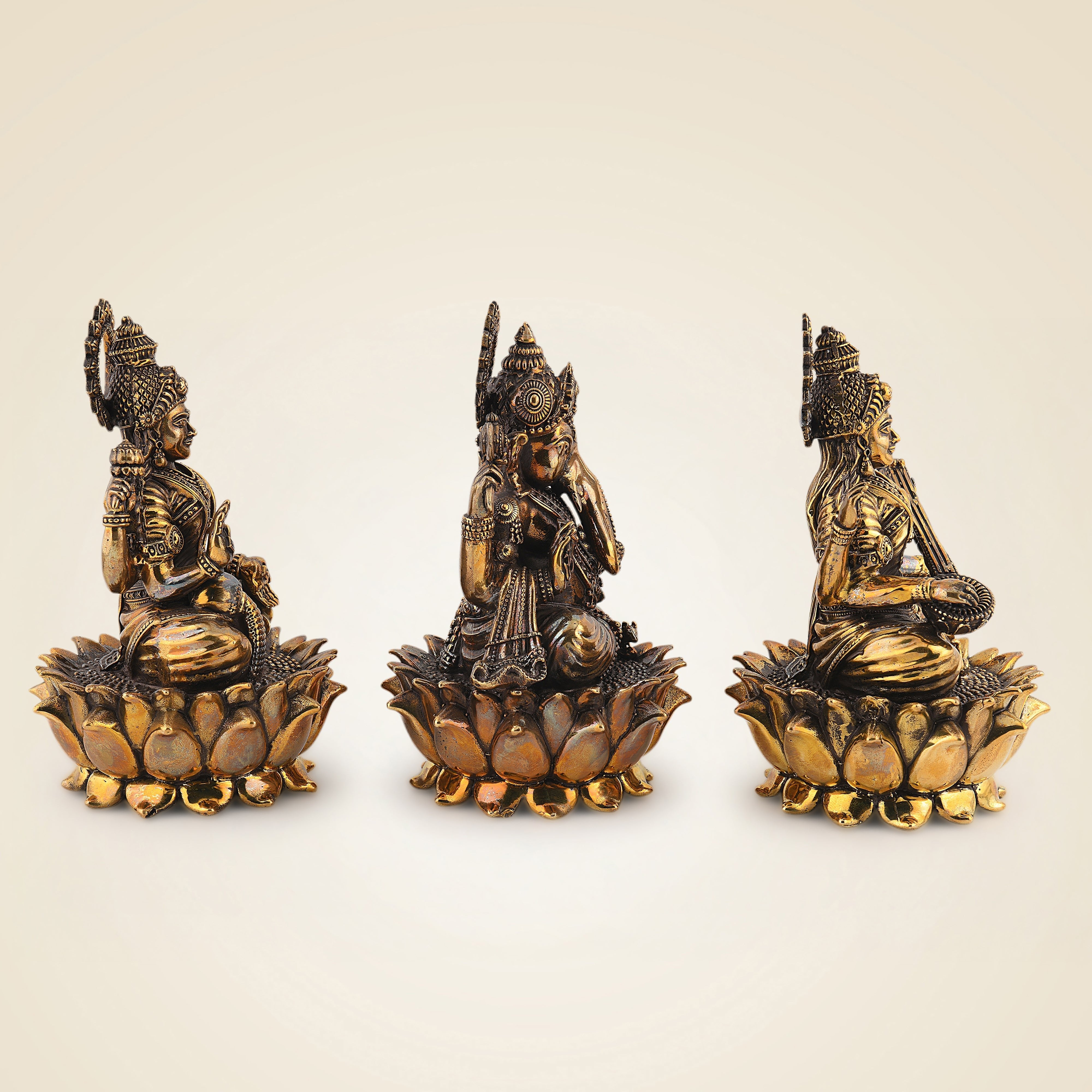 Laxmi Ganesh Saraswati Idol – 6" Handmade Brass Murti on Lotus