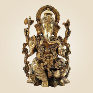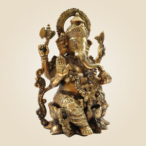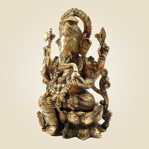 Lord Ganesh on Lotus Brass Idol – Heavy Handcrafted Ganpati Murti - 12.25"