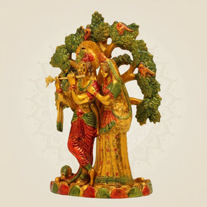 Hand-Painted Brass Radha Krishna Idol – Tree Design Murti for Mandir 12"
