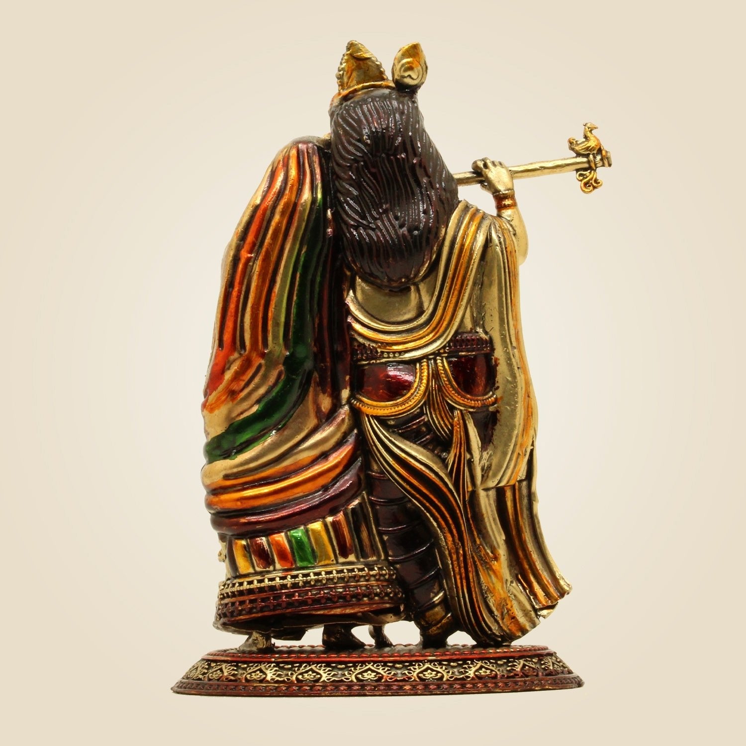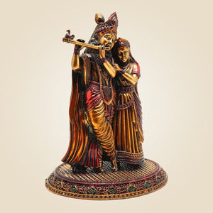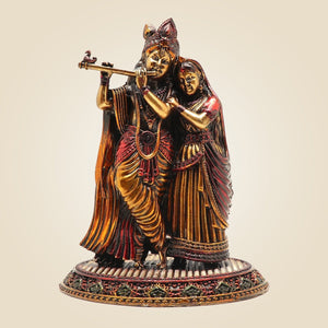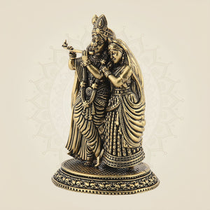 This 4.25-inch Radha Krishna brass idol is a finely handcrafted statue that captures the divine leela of the revered deities. Crafted with attention to detail, it serves both as a spiritual centerpiece and an elegant decor item. Ideal for personal altars or sophisticated interiors, this brass idol brings a timeless aura while fostering a serene and devotional ambiance.