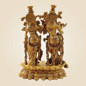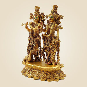 This exquisite South Indian style brass idol features Radha and Krishna masterfully crafted in traditional form, accompanied by a detailed peacock symbolizing beauty and spirituality. Measuring 13.5 inches, this statue is a perfect blend of artistry and devotion, ideal for enhancing your sacred space or home décor with a touch of divine elegance. Its durable brass construction ensures lasting shine and cultural authenticity.