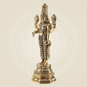 This 19-inch brass idol of Lord Venkateswara, also known as Tirupati Balaji, is a finely crafted Vishnu murti that embodies traditional South Indian artistry. Its detailed design reflects deep cultural and spiritual significance, making it an ideal piece for devotees and collectors alike. Crafted in durable brass, this idol offers both a lasting tribute to divine grace and an elegant addition to any sacred space or home altar.