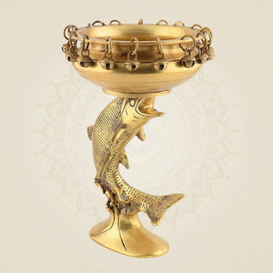 Crafted from durable brass, the Big Fish Brass Urli Bowl measures 11 inches in diameter, blending traditional design with functional elegance. Ideal for Diwali celebrations, temple offerings, or enhancing your home decor, this ethnic pot serves as both a decorative centerpiece and a meaningful gift. Its timeless craftsmanship ensures a lasting appeal, making it a distinguished addition to any cultural or ceremonial setting.