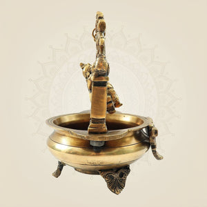 This elegant 9.25" brass Ganesh idol features the deity seated on a delicately crafted jula (swing), accompanied by a traditional urli, symbolizing prosperity and auspiciousness. Its intricate detailing and polished finish make it a refined decorative piece for your home or a thoughtful gift, enhancing spiritual ambiance with timeless artistry.