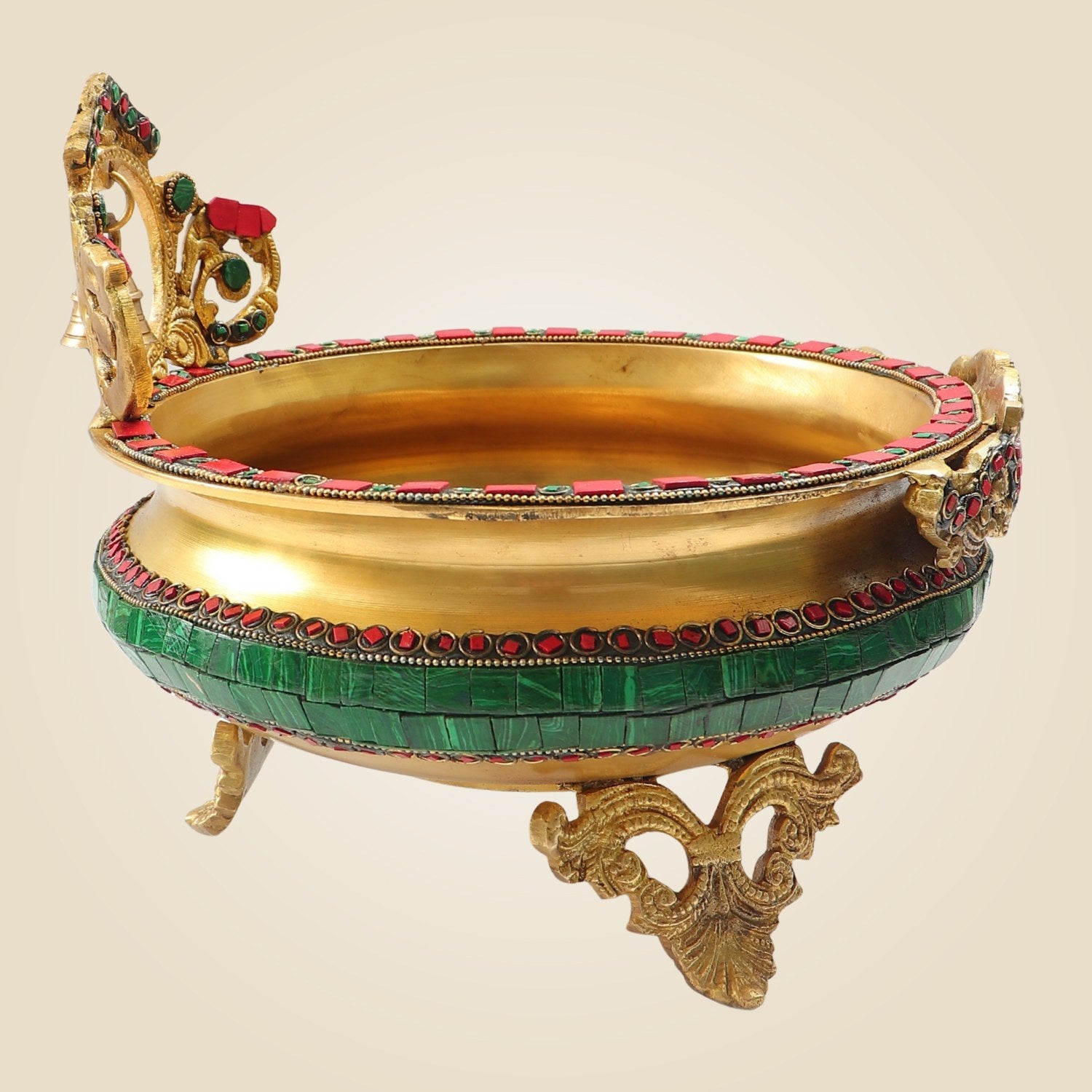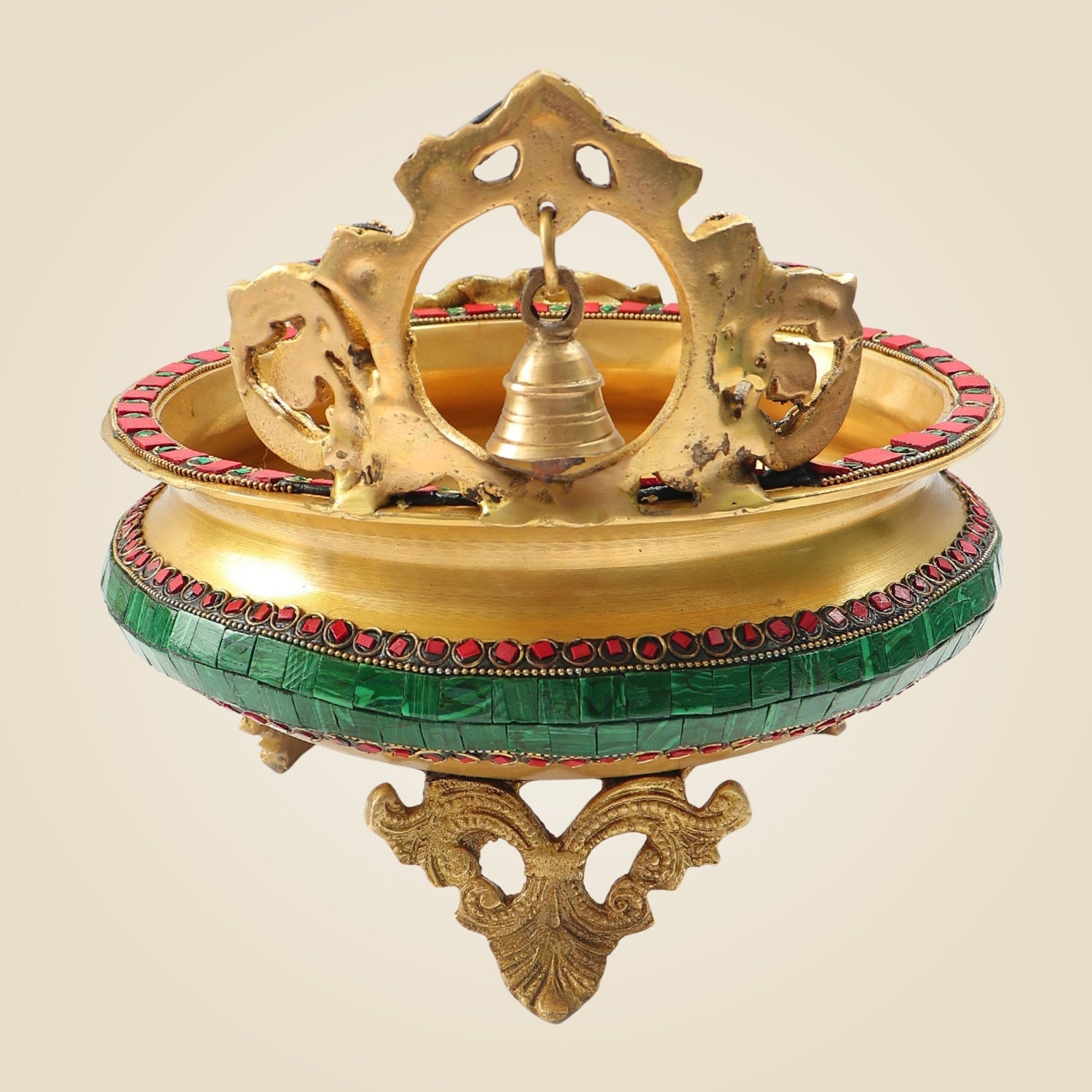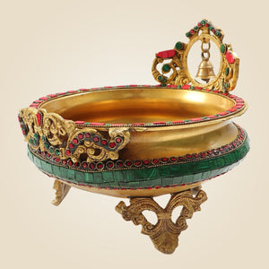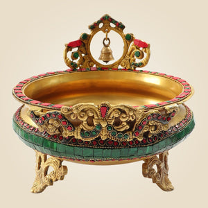 Handcrafted Brass Urli 9"- Bell Accents & Stone Work Decorative Piece